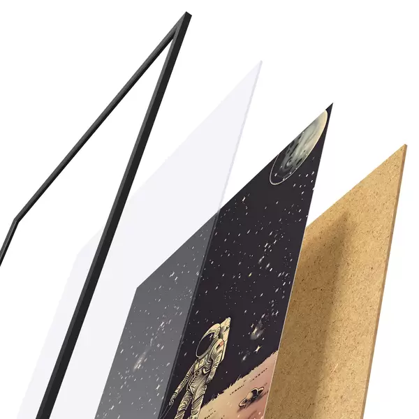 Das Poster besteht aus einem Rahmen, Plexiglas, einem gedruckten Bild und einer Rückwand aus Spanplatten. Dank der Halterungen auf der Rückseite kann das Poster sofort an die Wand gehängt werden.
