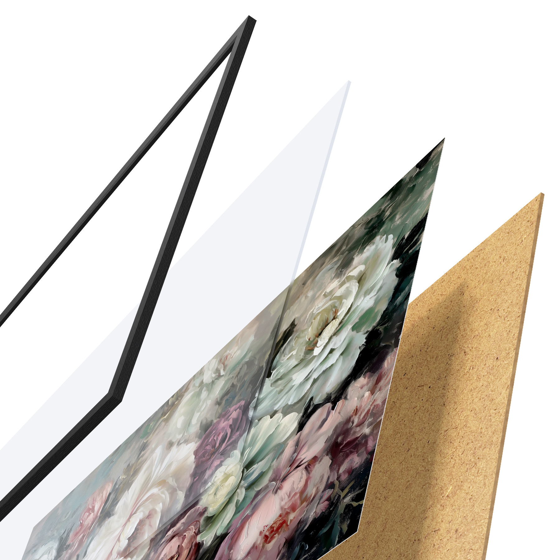 Das Poster besteht aus einem Rahmen, Plexiglas, einem gedruckten Bild und einer Rückwand aus Spanplatten. Dank der Halterungen auf der Rückseite kann das Poster sofort an die Wand gehängt werden.