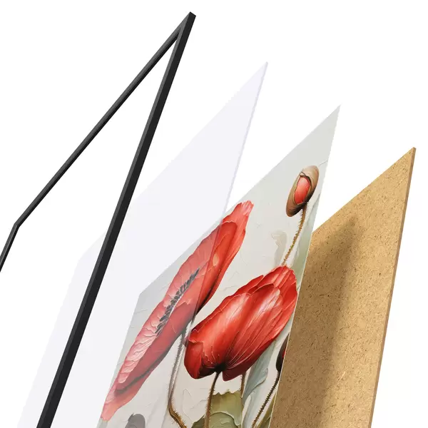 Das Poster besteht aus einem Rahmen, Plexiglas, einem gedruckten Bild und einer Rückwand aus Spanplatten. Dank der Halterungen auf der Rückseite kann das Poster sofort an die Wand gehängt werden.