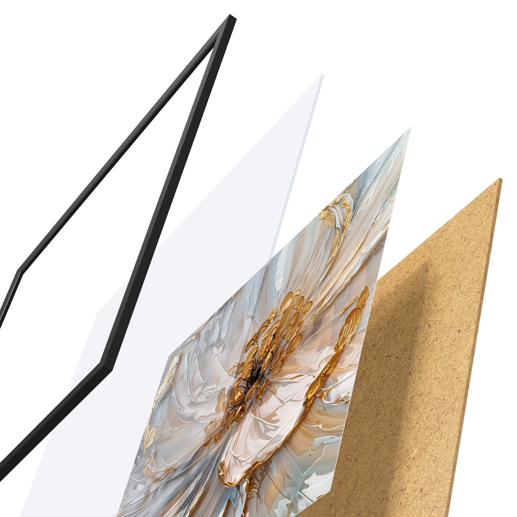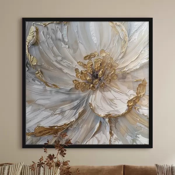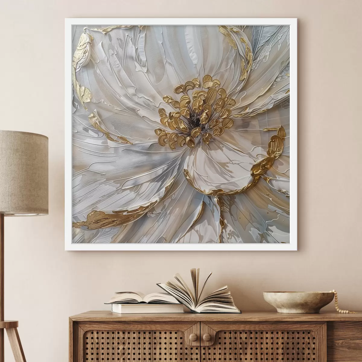 Poster Nahaufnahme einer großen weißen Blume mit gelben Staubgefäßen im Inneren, künstlerische Dekoration in Ölfarbe f38755