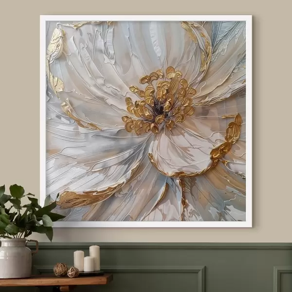 Poster Nahaufnahme einer großen weißen Blume mit gelben Staubgefäßen im Inneren, künstlerische Dekoration in Ölfarbe f38755