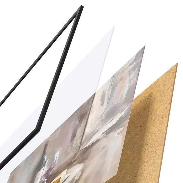 Das Poster besteht aus einem Rahmen, Plexiglas, einem gedruckten Bild und einer Rückwand aus Spanplatten. Dank der Halterungen auf der Rückseite kann das Poster sofort an die Wand gehängt werden.