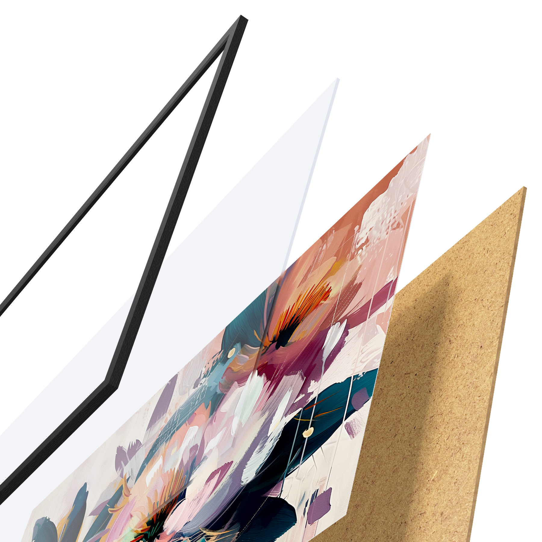 Das Poster besteht aus einem Rahmen, Plexiglas, einem gedruckten Bild und einer Rückwand aus Spanplatten. Dank der Halterungen auf der Rückseite kann das Poster sofort an die Wand gehängt werden.