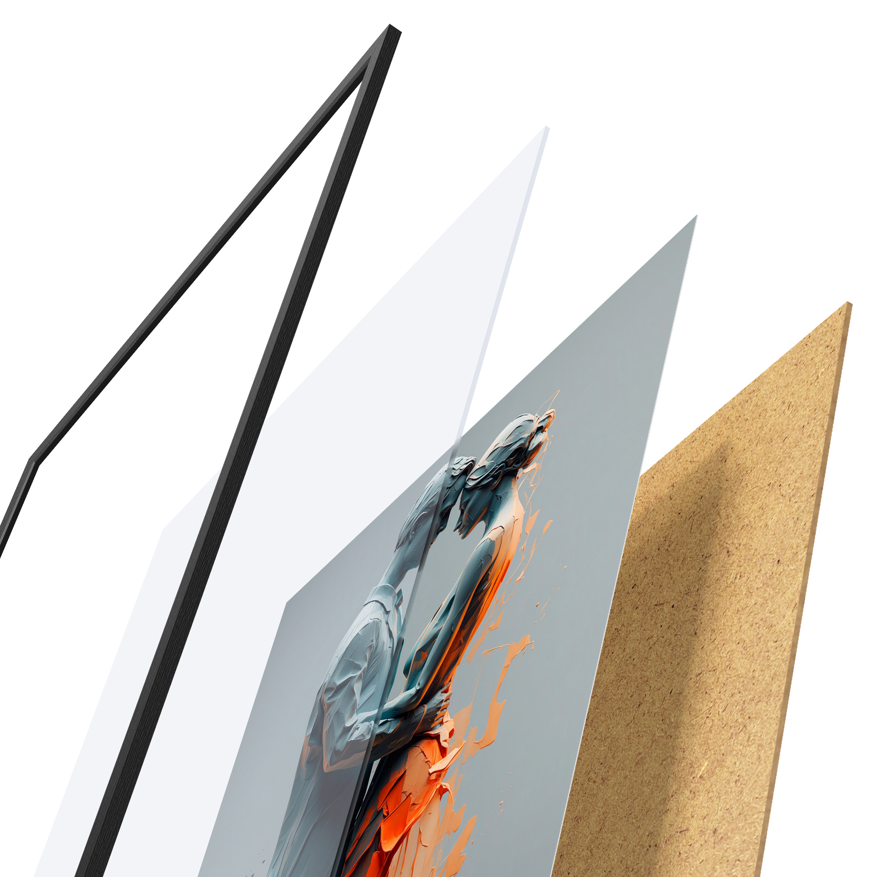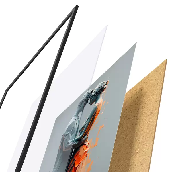 Das Poster besteht aus einem Rahmen, Plexiglas, einem gedruckten Bild und einer Rückwand aus Spanplatten. Dank der Halterungen auf der Rückseite kann das Poster sofort an die Wand gehängt werden.