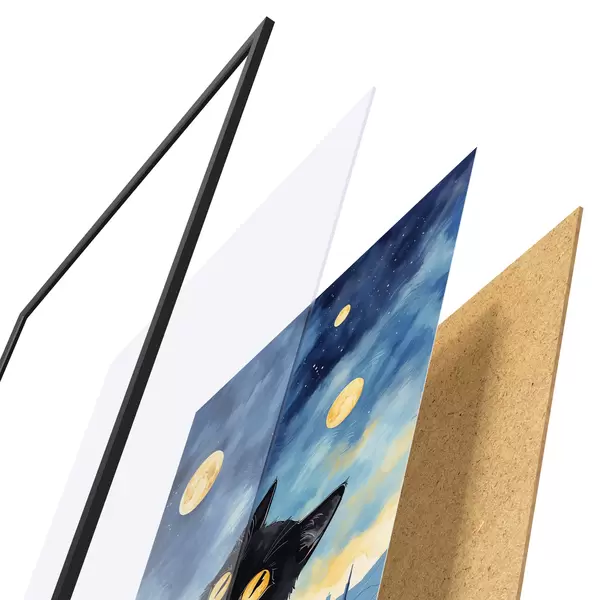 Das Poster besteht aus einem Rahmen, Plexiglas, einem gedruckten Bild und einer Rückwand aus Spanplatten. Dank der Halterungen auf der Rückseite kann das Poster sofort an die Wand gehängt werden.