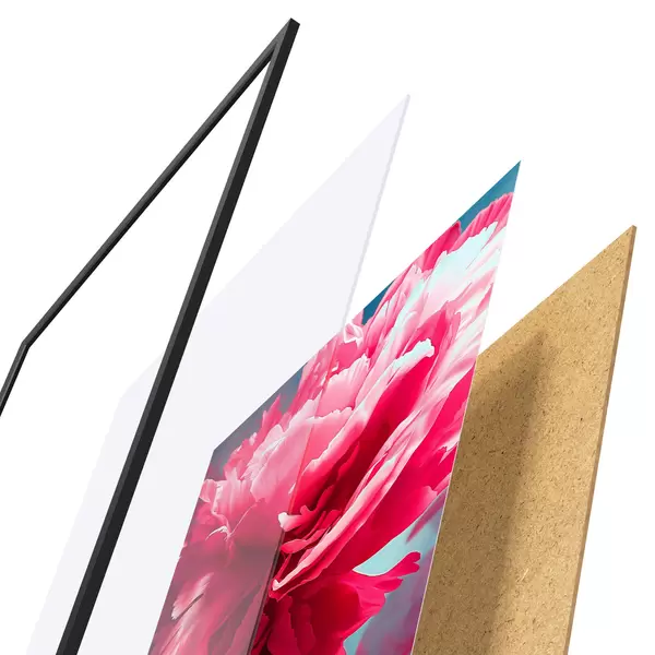 Das Poster besteht aus einem Rahmen, Plexiglas, einem gedruckten Bild und einer Rückwand aus Spanplatten. Dank der Halterungen auf der Rückseite kann das Poster sofort an die Wand gehängt werden.