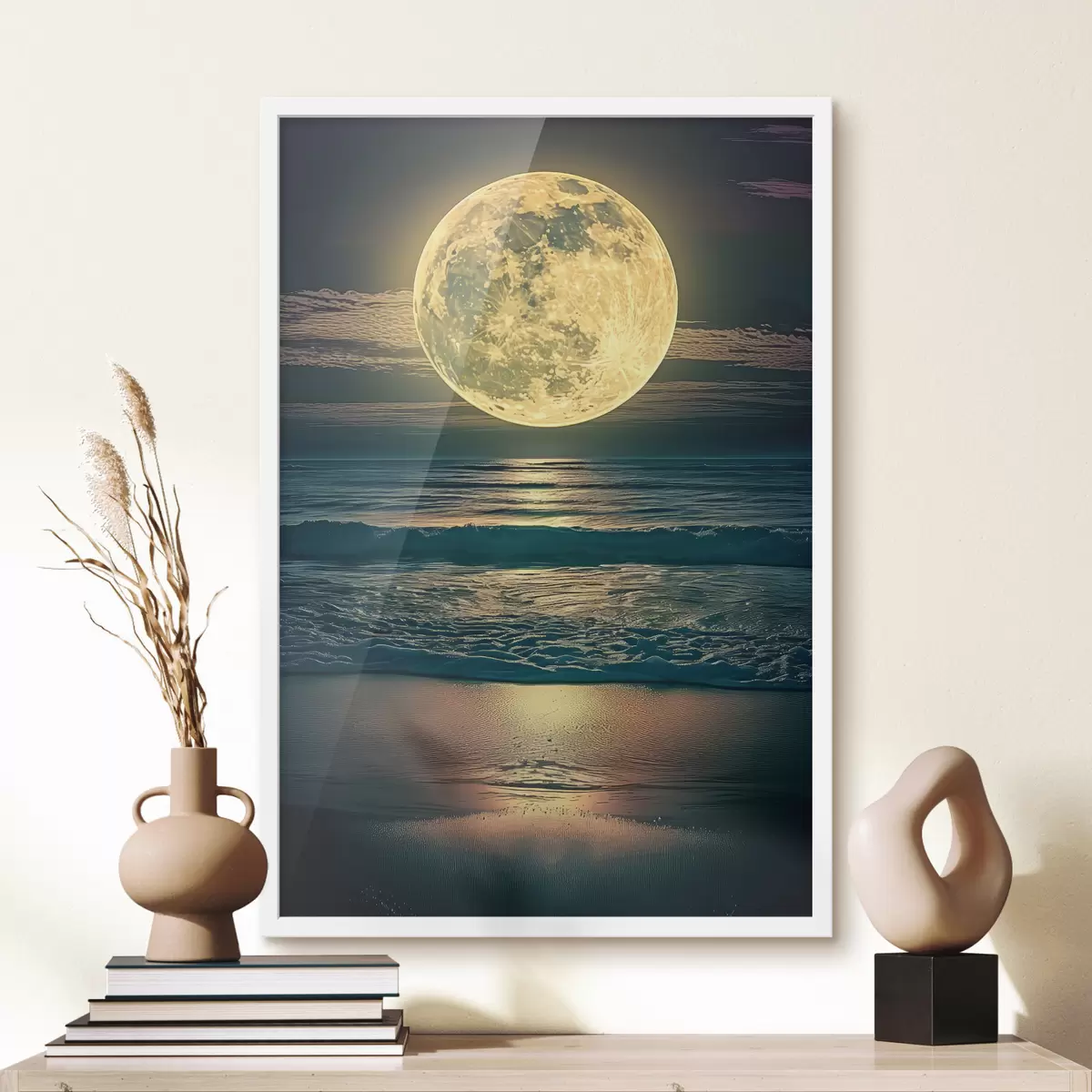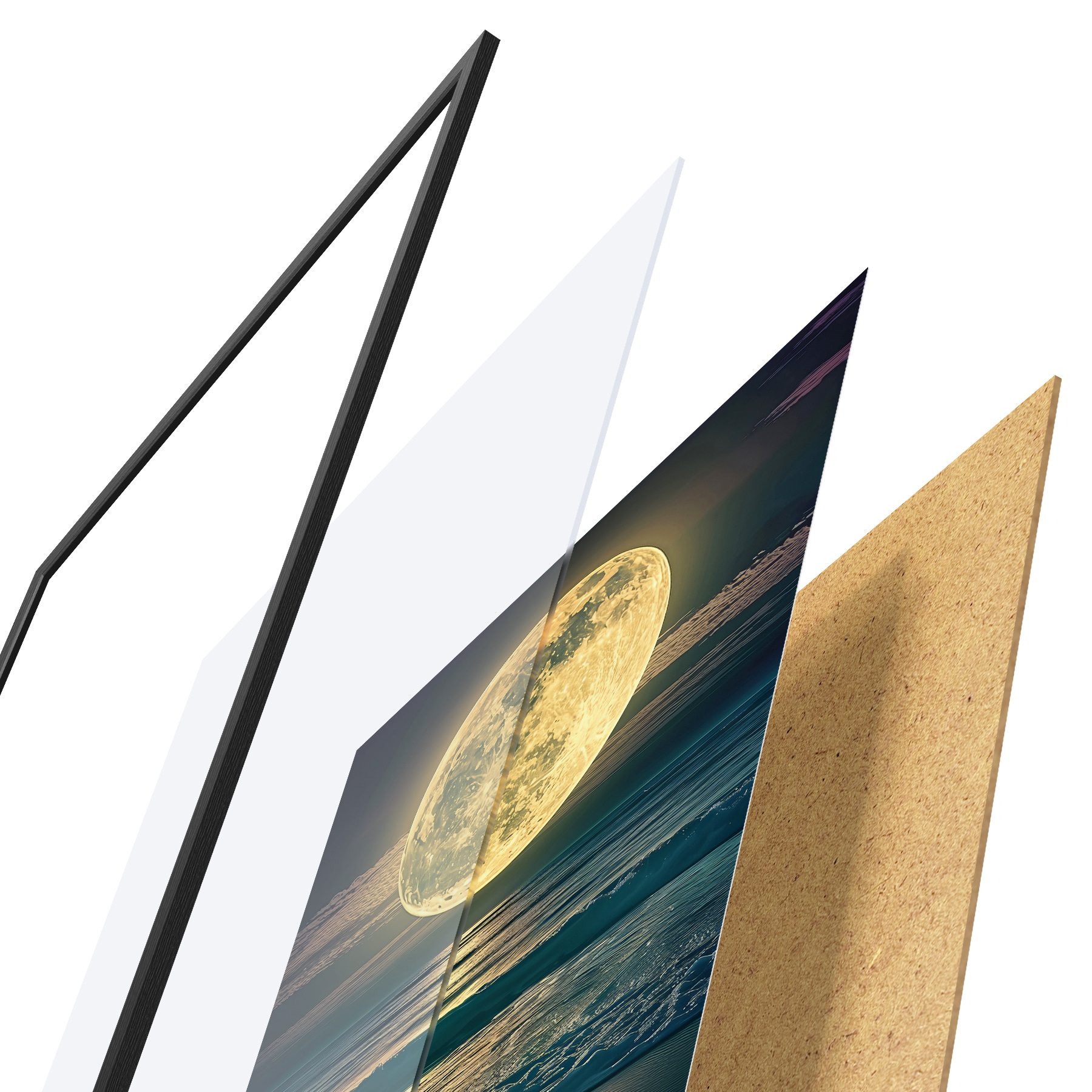 Das Poster besteht aus einem Rahmen, Plexiglas, einem gedruckten Bild und einer Rückwand aus Spanplatten. Dank der Halterungen auf der Rückseite kann das Poster sofort an die Wand gehängt werden.