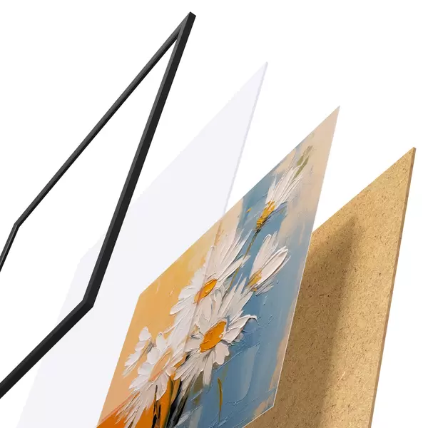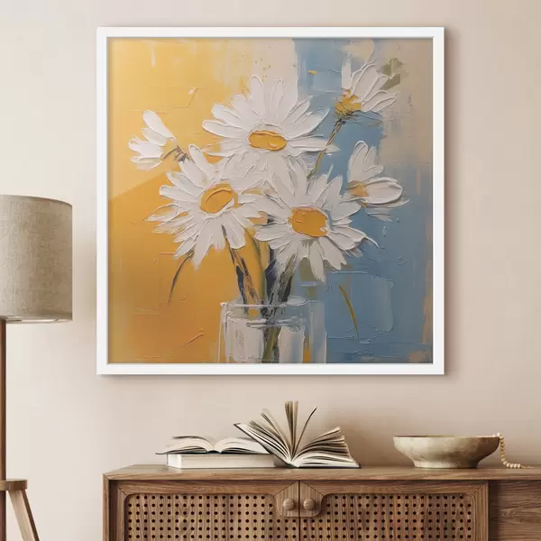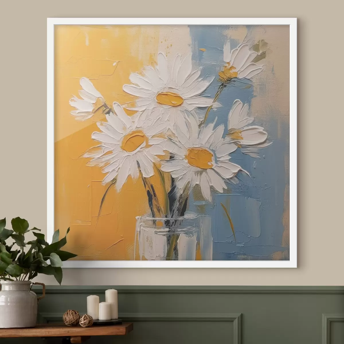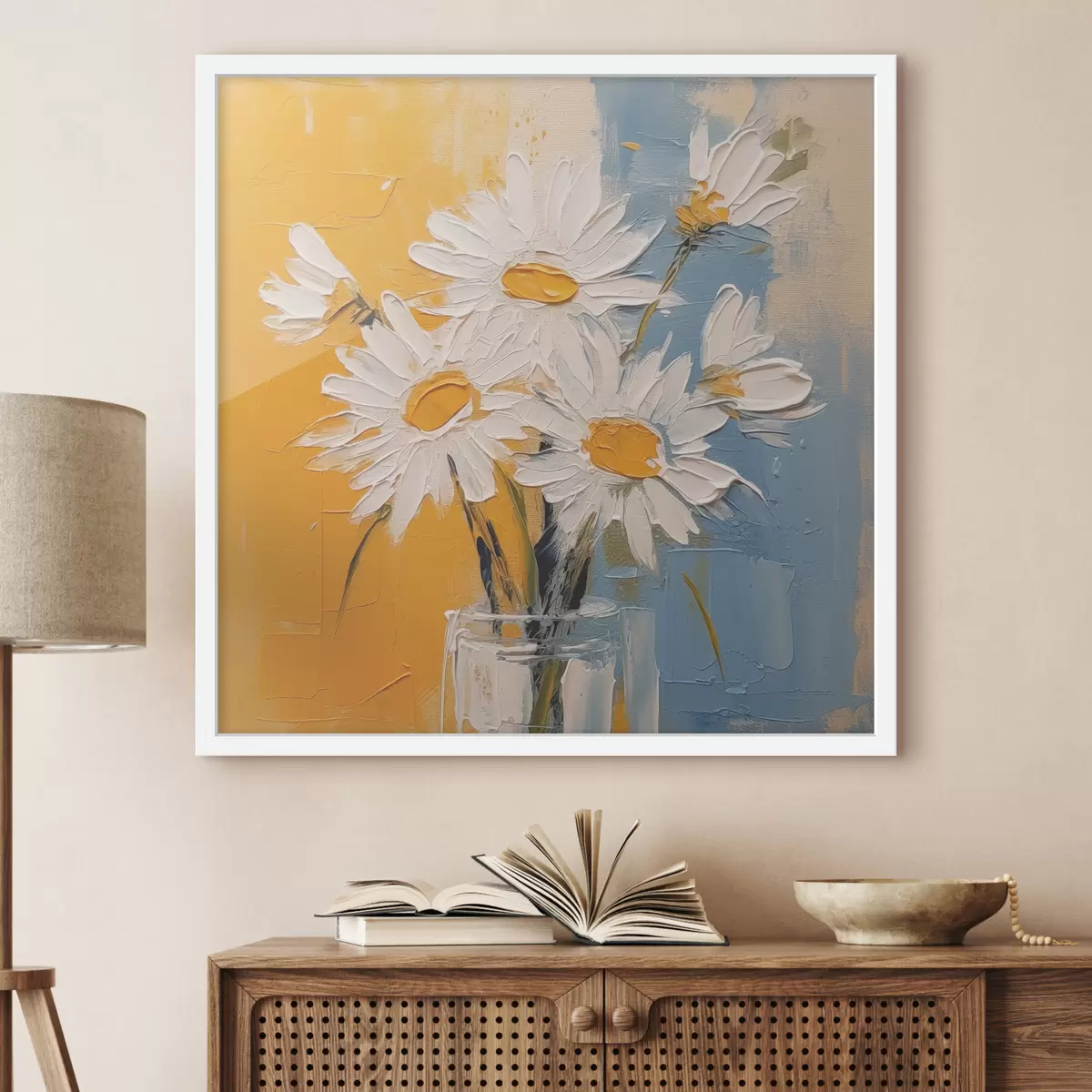 Poster Weiße Gänseblümchen in einer Glasvase auf blauem und gelbem Hintergrund, Imitation eines Ölgemäldes, große Striche Nr f38907