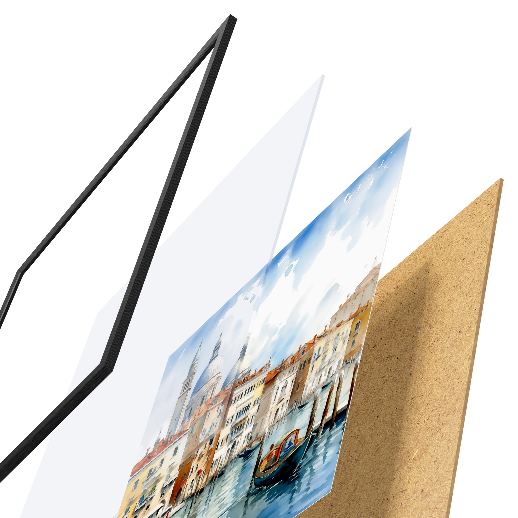 Das Poster besteht aus einem Rahmen, Plexiglas, einem gedruckten Bild und einer Rückwand aus Spanplatten. Dank der Halterungen auf der Rückseite kann das Poster sofort an die Wand gehängt werden.