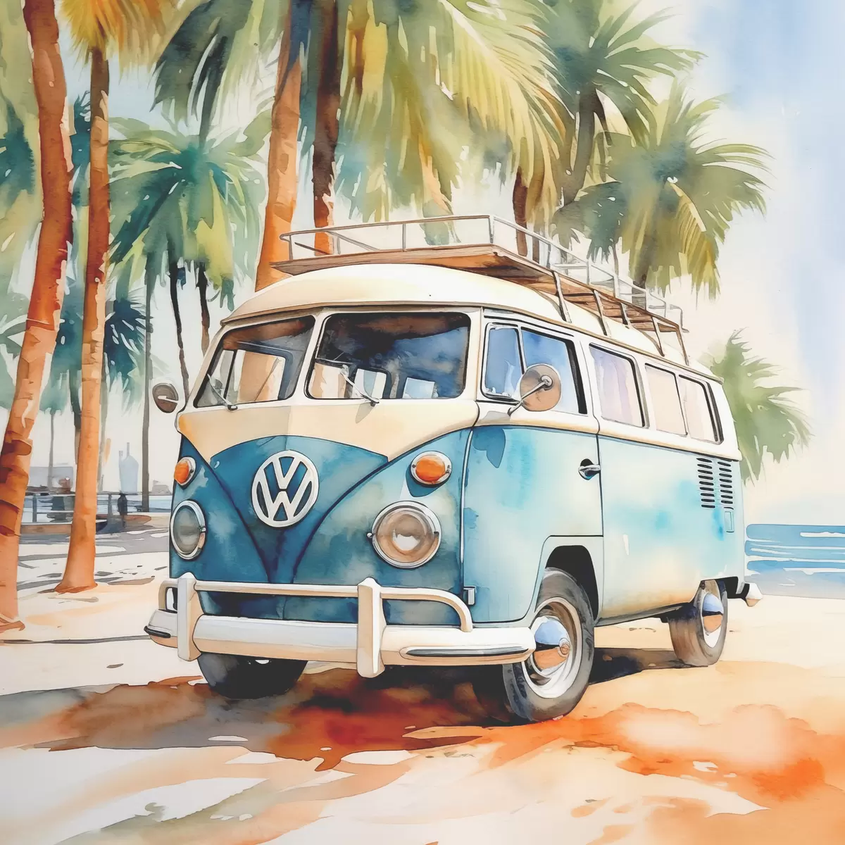 Poster Ein Reiseauto ist am Strand vor einem Hintergrund von Aquarellpalmen geparkt Nr f38911