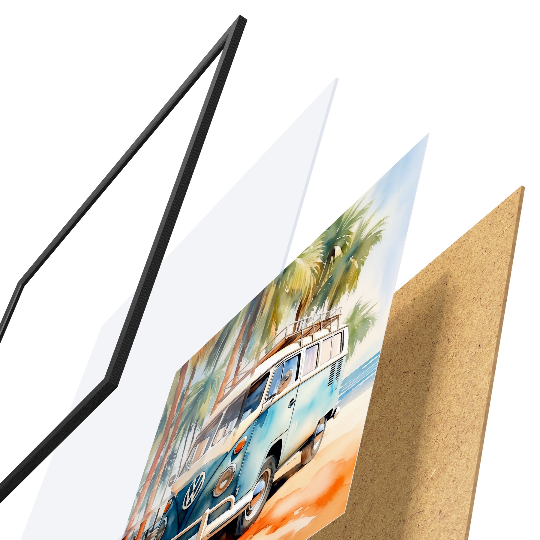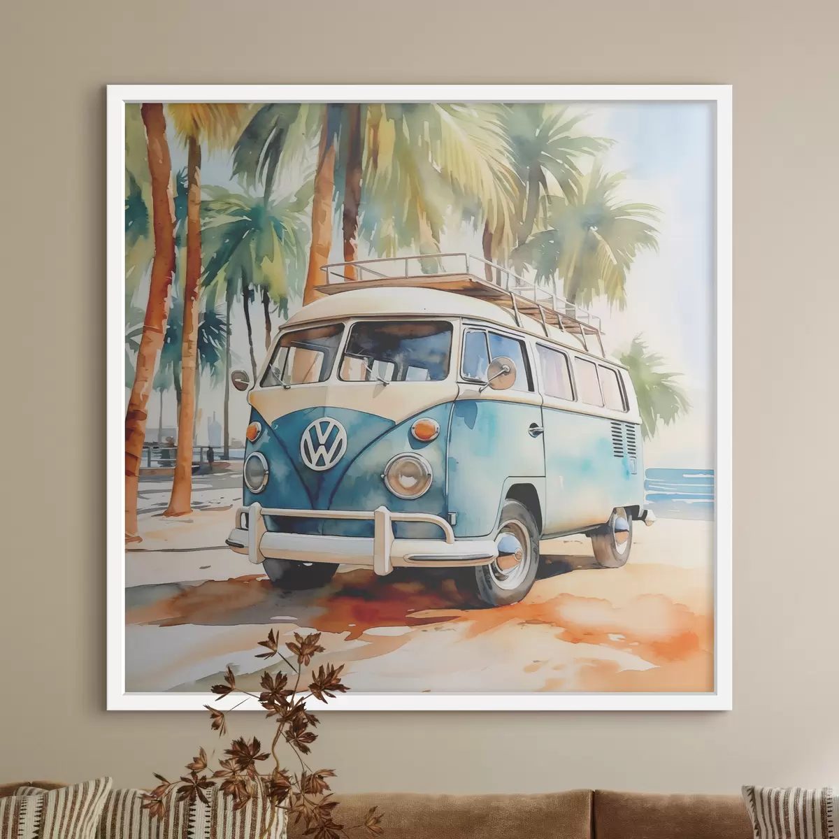 Poster Ein Reiseauto ist am Strand vor einem Hintergrund von Aquarellpalmen geparkt f38911