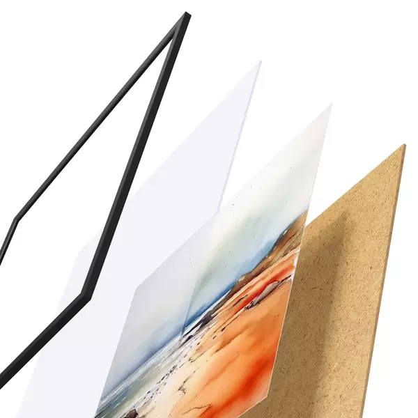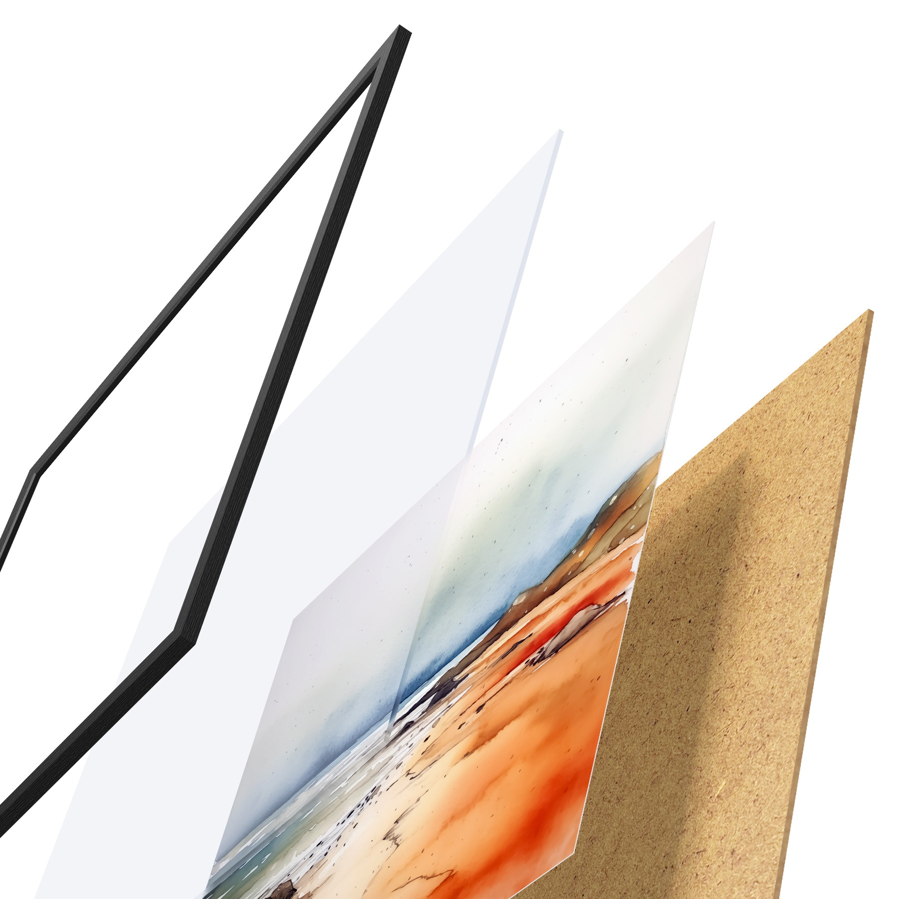 Das Poster besteht aus einem Rahmen, Plexiglas, einem gedruckten Bild und einer Rückwand aus Spanplatten. Dank der Halterungen auf der Rückseite kann das Poster sofort an die Wand gehängt werden.