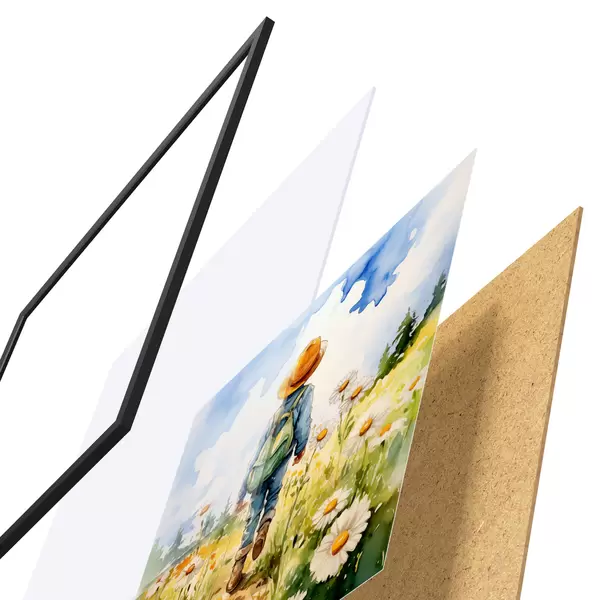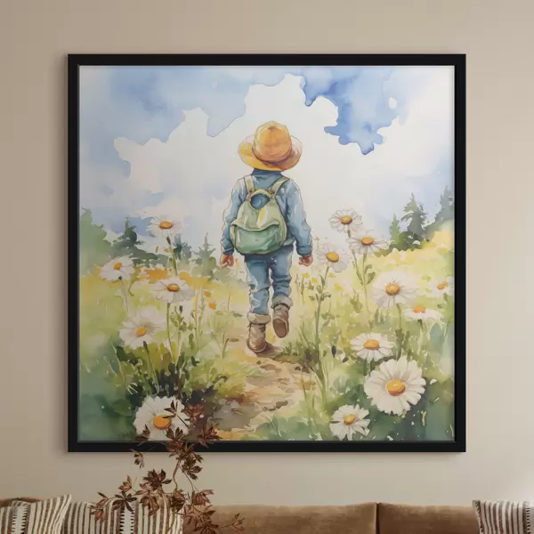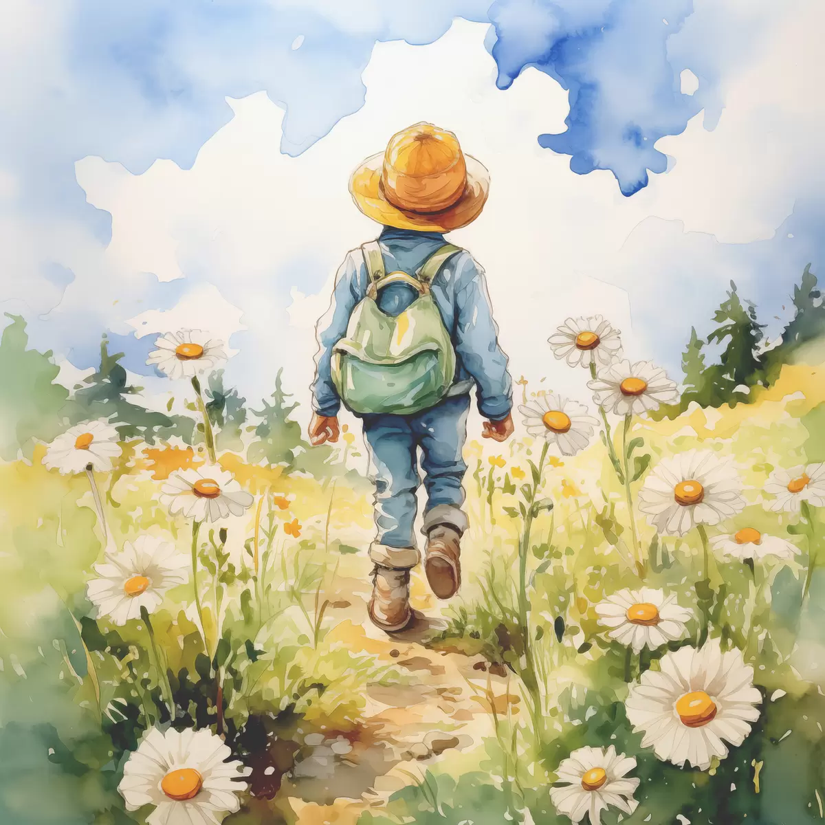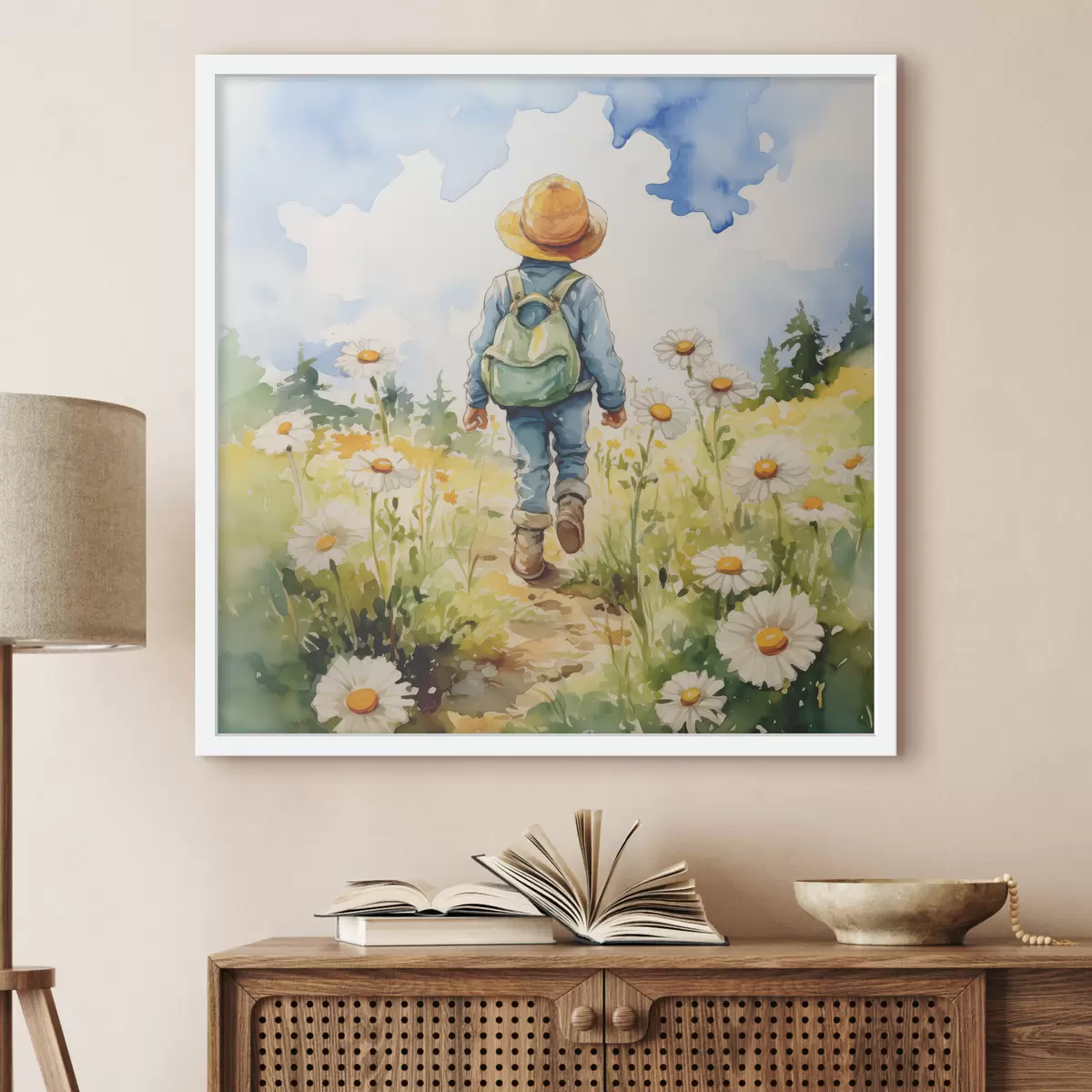 Poster Ein Junge mit Cowboyhut, grünem Rucksack auf dem Rücken und blauem Anzug geht einen Weg durch ein Kamillenfeld entlang, Aquarell Nr f38946