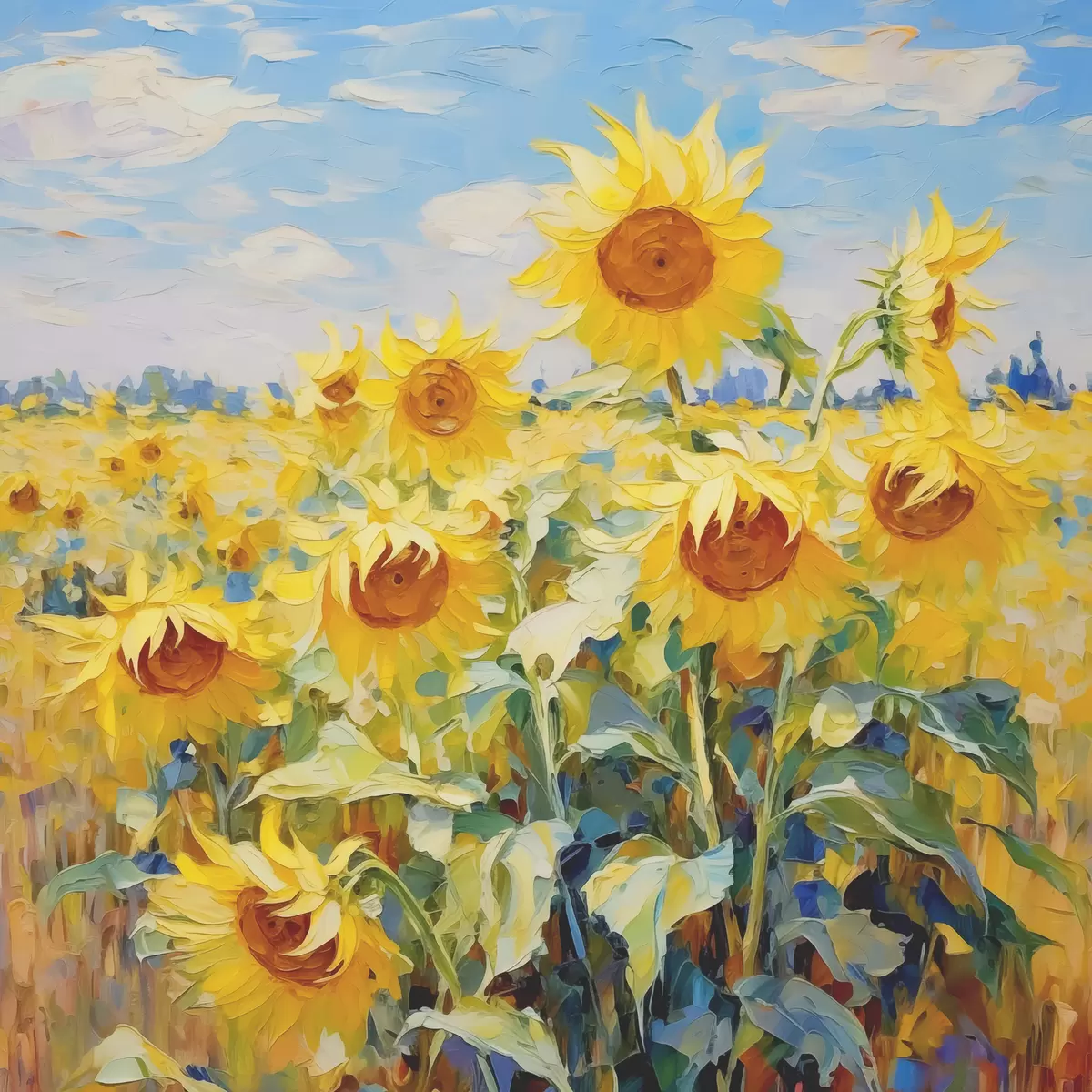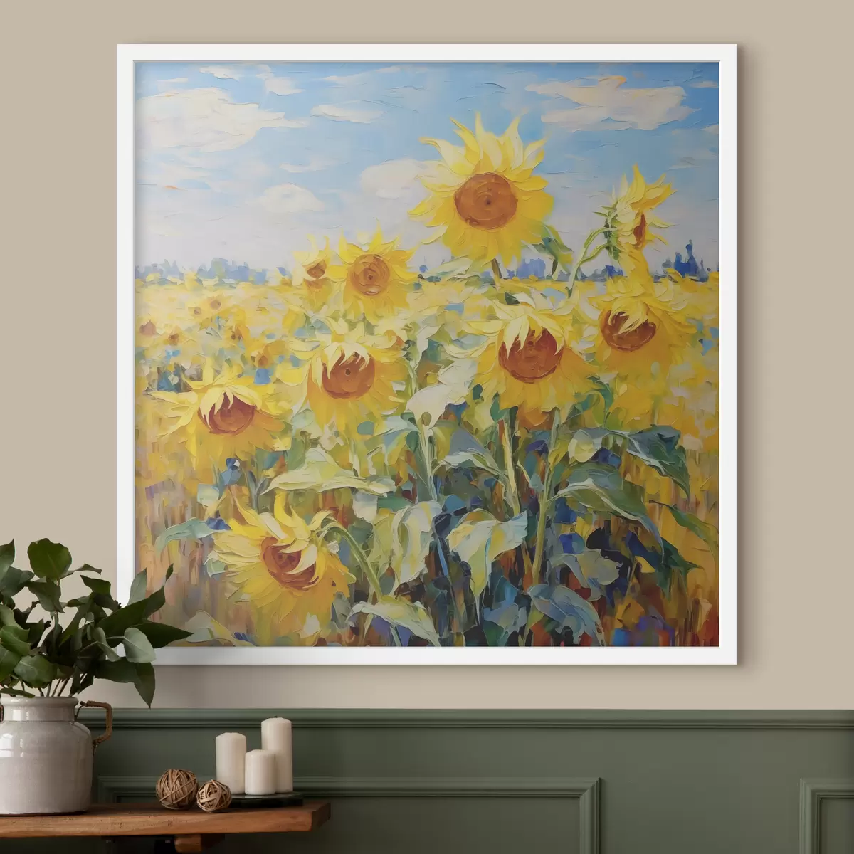 Poster Sonnenblumenfeld Ölgemälde, gelb und blau Nr f38953
