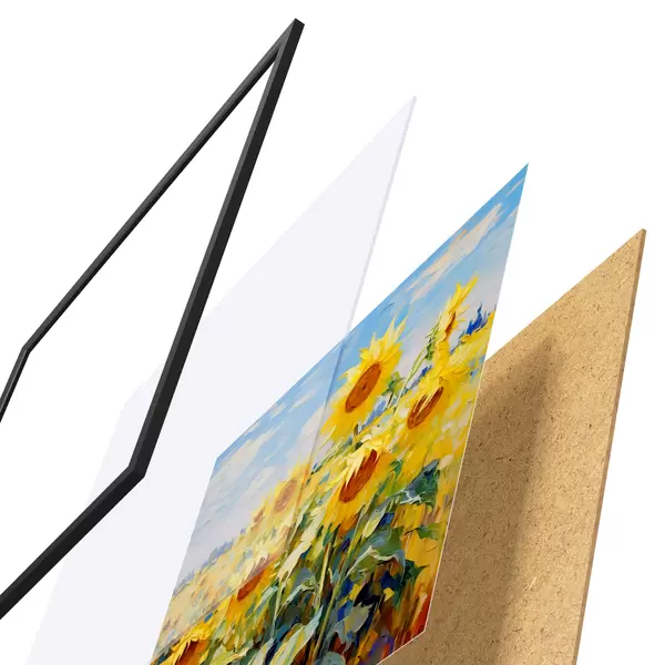 Das Poster besteht aus einem Rahmen, Plexiglas, einem gedruckten Bild und einer Rückwand aus Spanplatten. Dank der Halterungen auf der Rückseite kann das Poster sofort an die Wand gehängt werden.