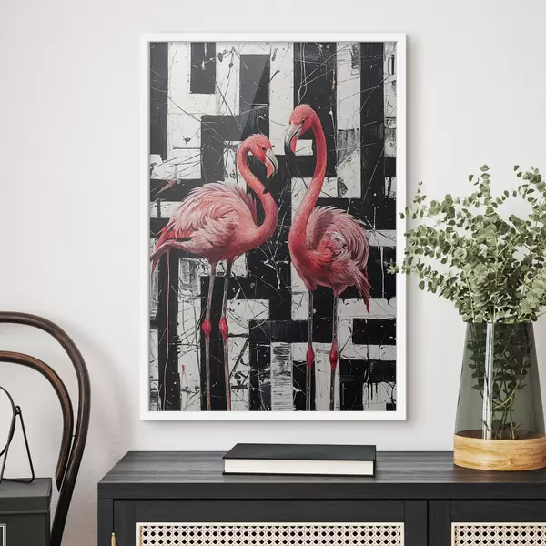 Poster Zwei rosa Flamingos stehen vor einem schwarz-weißen abstrakten Hintergrund Kunstgemälde Nr f38954