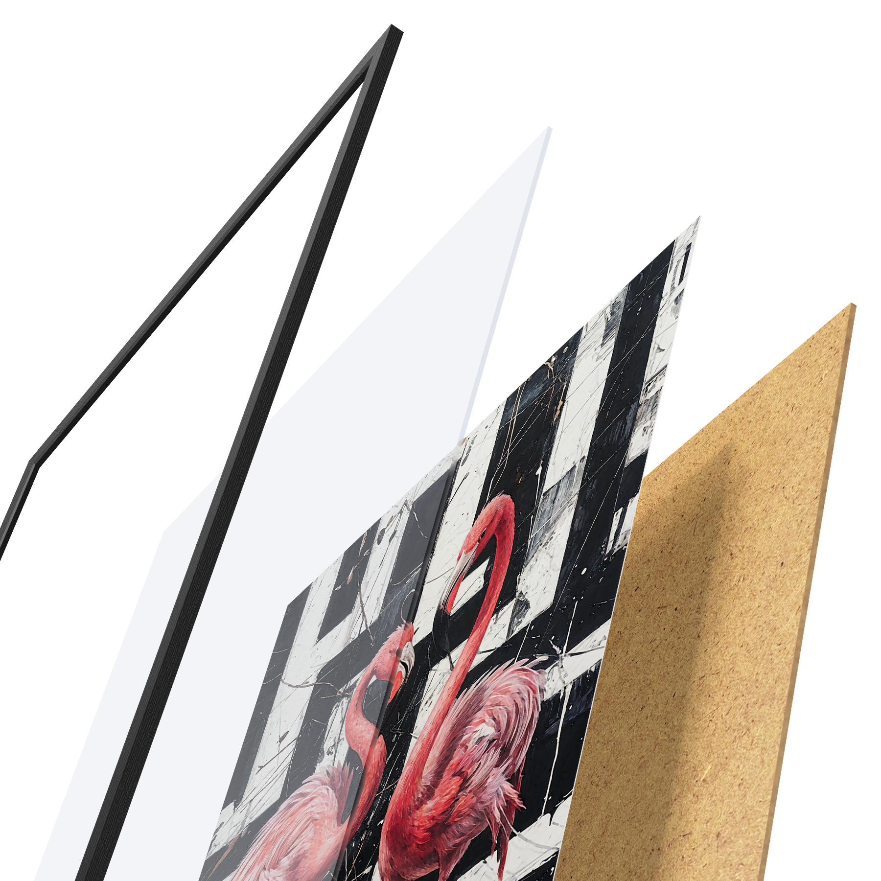 Poster Zwei rosa Flamingos stehen vor einem schwarz-weißen abstrakten Hintergrund Kunstgemälde f38954