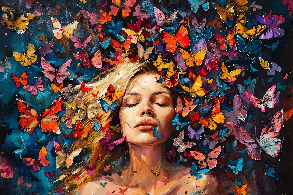 Poster Ölgemälde einer jungen Frau umgeben von einem Schwarm bunter Schmetterlinge vor dunklem Hintergrund f38972