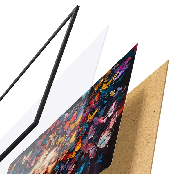 Das Poster besteht aus einem Rahmen, Plexiglas, einem gedruckten Bild und einer Rückwand aus Spanplatten. Dank der Halterungen auf der Rückseite kann das Poster sofort an die Wand gehängt werden.