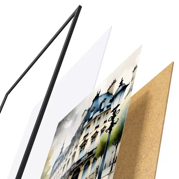 Das Poster besteht aus einem Rahmen, Plexiglas, einem gedruckten Bild und einer Rückwand aus Spanplatten. Dank der Halterungen auf der Rückseite kann das Poster sofort an die Wand gehängt werden.