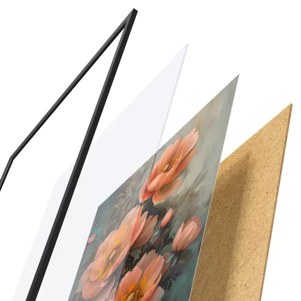 Das Poster besteht aus einem Rahmen, Plexiglas, einem gedruckten Bild und einer Rückwand aus Spanplatten. Dank der Halterungen auf der Rückseite kann das Poster sofort an die Wand gehängt werden.