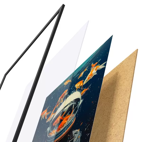Das Poster besteht aus einem Rahmen, Plexiglas, einem gedruckten Bild und einer Rückwand aus Spanplatten. Dank der Halterungen auf der Rückseite kann das Poster sofort an die Wand gehängt werden.