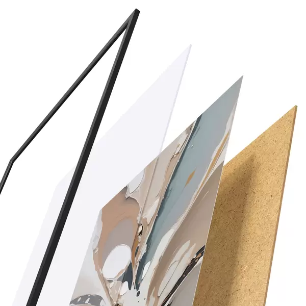 Das Poster besteht aus einem Rahmen, Plexiglas, einem gedruckten Bild und einer Rückwand aus Spanplatten. Dank der Halterungen auf der Rückseite kann das Poster sofort an die Wand gehängt werden.