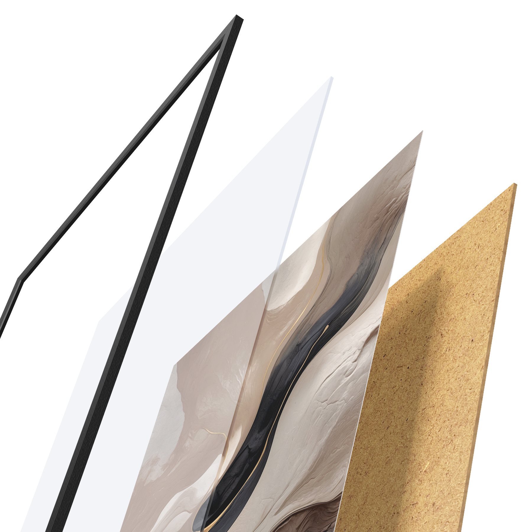 Das Poster besteht aus einem Rahmen, Plexiglas, einem gedruckten Bild und einer Rückwand aus Spanplatten. Dank der Halterungen auf der Rückseite kann das Poster sofort an die Wand gehängt werden.