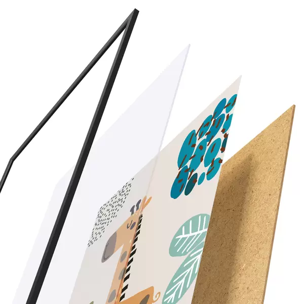 Das Poster besteht aus einem Rahmen, Plexiglas, einem gedruckten Bild und einer Rückwand aus Spanplatten. Dank der Halterungen auf der Rückseite kann das Poster sofort an die Wand gehängt werden.