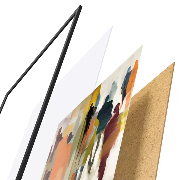 Das Poster besteht aus einem Rahmen, Plexiglas, einem gedruckten Bild und einer Rückwand aus Spanplatten. Dank der Halterungen auf der Rückseite kann das Poster sofort an die Wand gehängt werden.