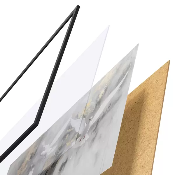 Das Poster besteht aus einem Rahmen, Plexiglas, einem gedruckten Bild und einer Rückwand aus Spanplatten. Dank der Halterungen auf der Rückseite kann das Poster sofort an die Wand gehängt werden.