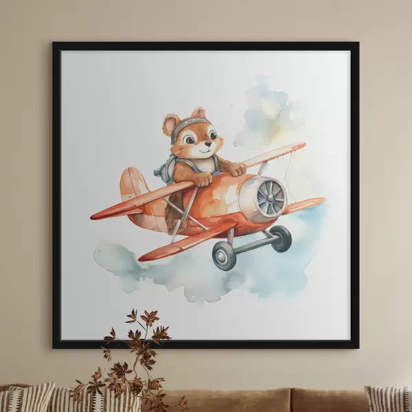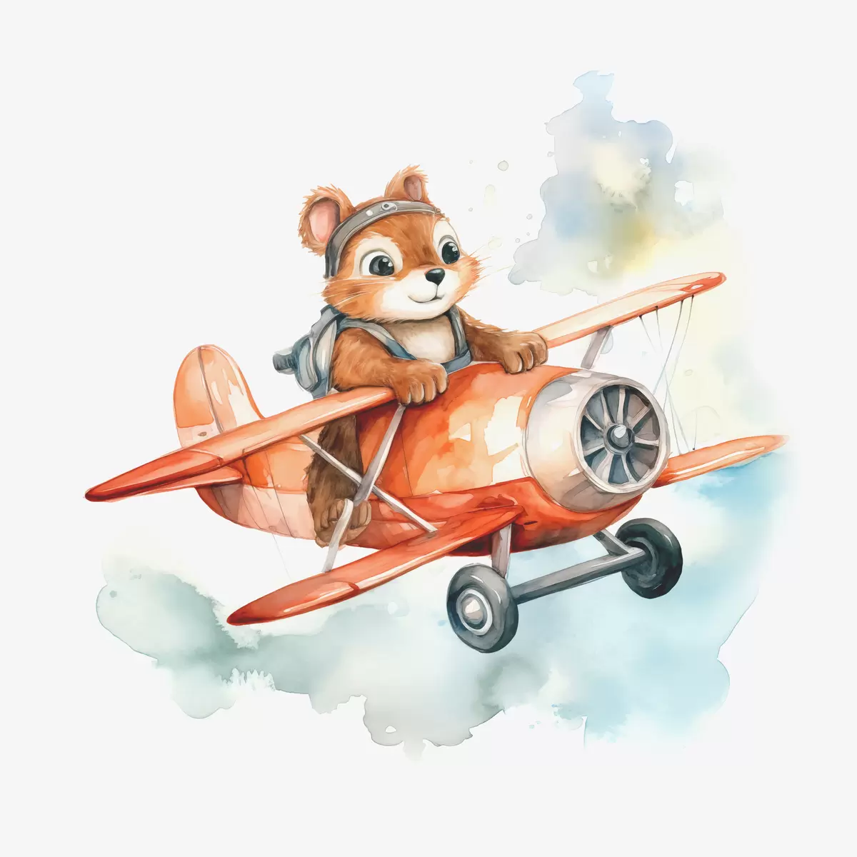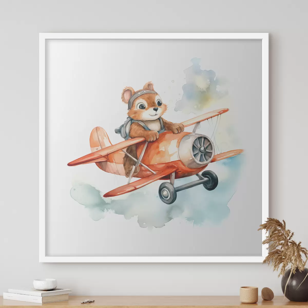 Poster Kleines Eichhörnchen fliegt in einer aquarellierten Kinderillustration eines roten Flugzeugs Nr f39116