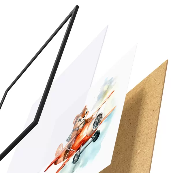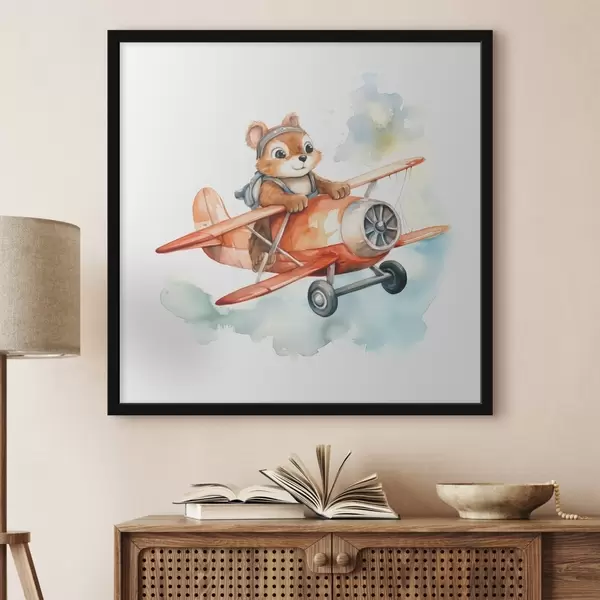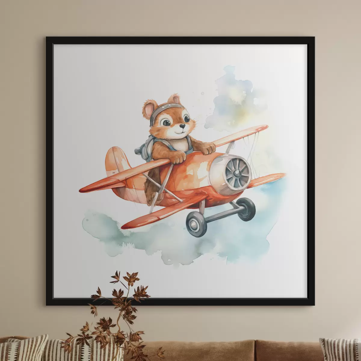 Poster Kleines Eichhörnchen fliegt in einer aquarellierten Kinderillustration eines roten Flugzeugs f39116