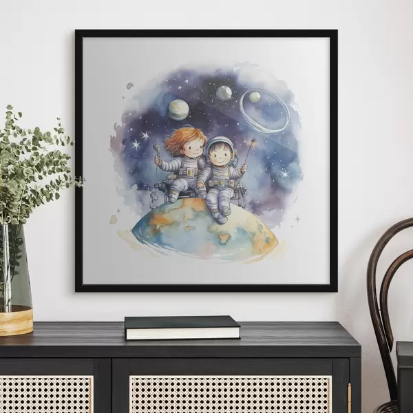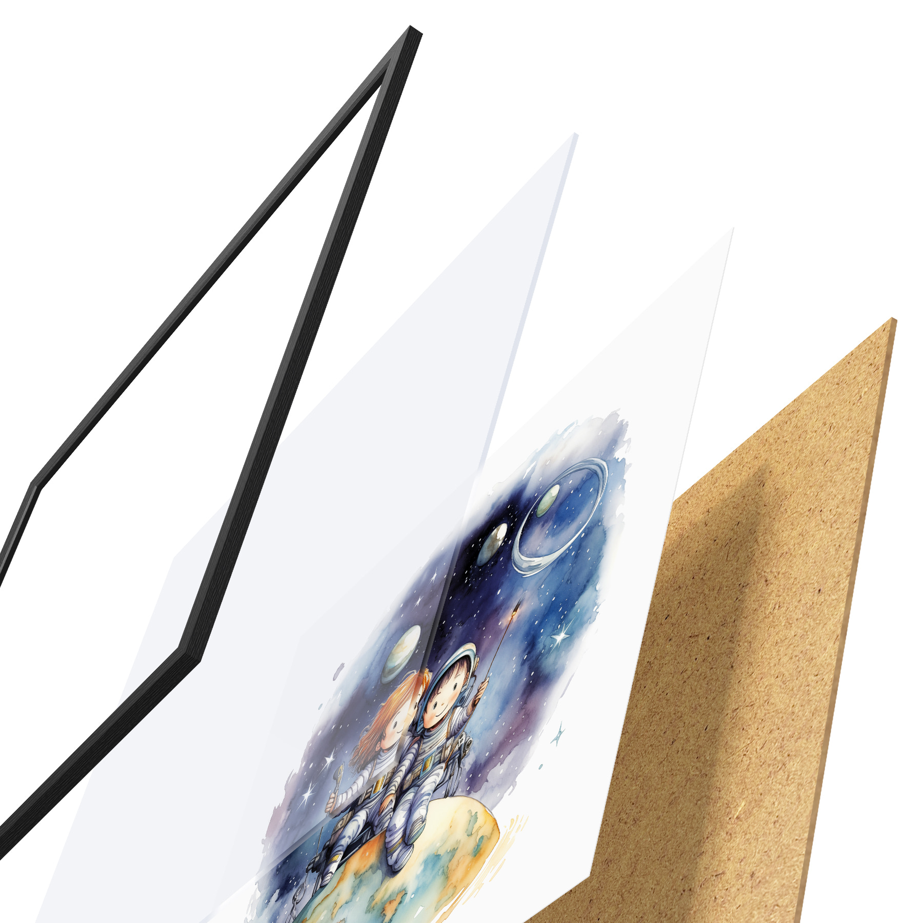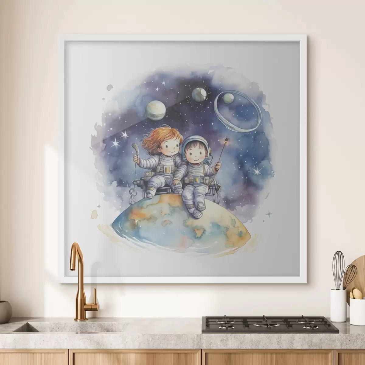 Poster Kinder in Raumanzügen sitzen auf einem Planeten im Raum Aquarell Illustration für Kinder Nr f39117