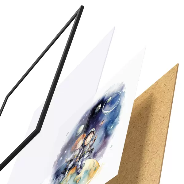 Das Poster besteht aus einem Rahmen, Plexiglas, einem gedruckten Bild und einer Rückwand aus Spanplatten. Dank der Halterungen auf der Rückseite kann das Poster sofort an die Wand gehängt werden.