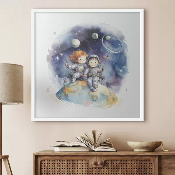 Poster Kinder in Raumanzügen sitzen auf einem Planeten im Raum Aquarell Illustration für Kinder Nr f39117