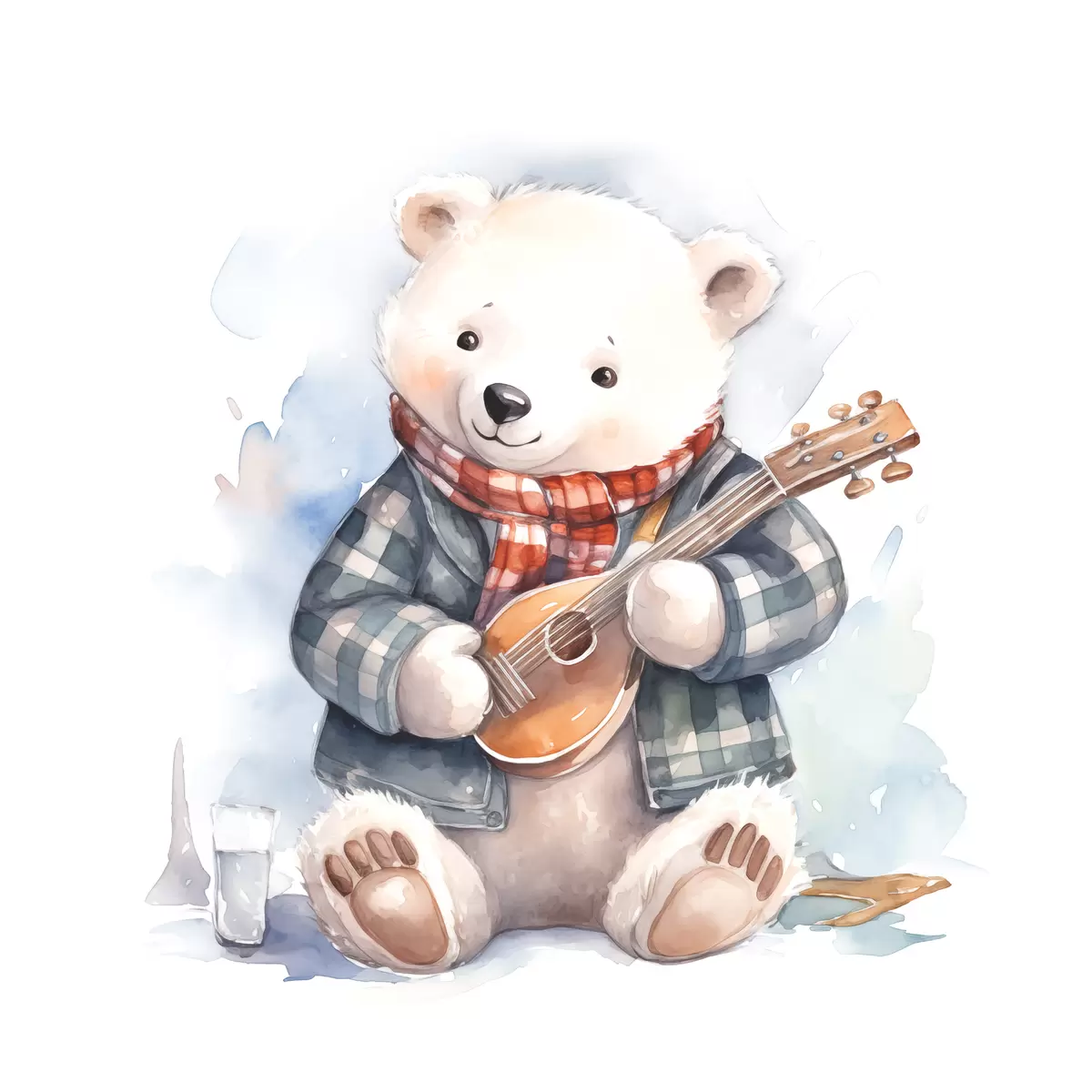 Poster Eisbär Musiker in einem blau-karierten Anzug und rotem Schal spielt die Gitarre Aquarell Illustration für Kinder Nr f39120