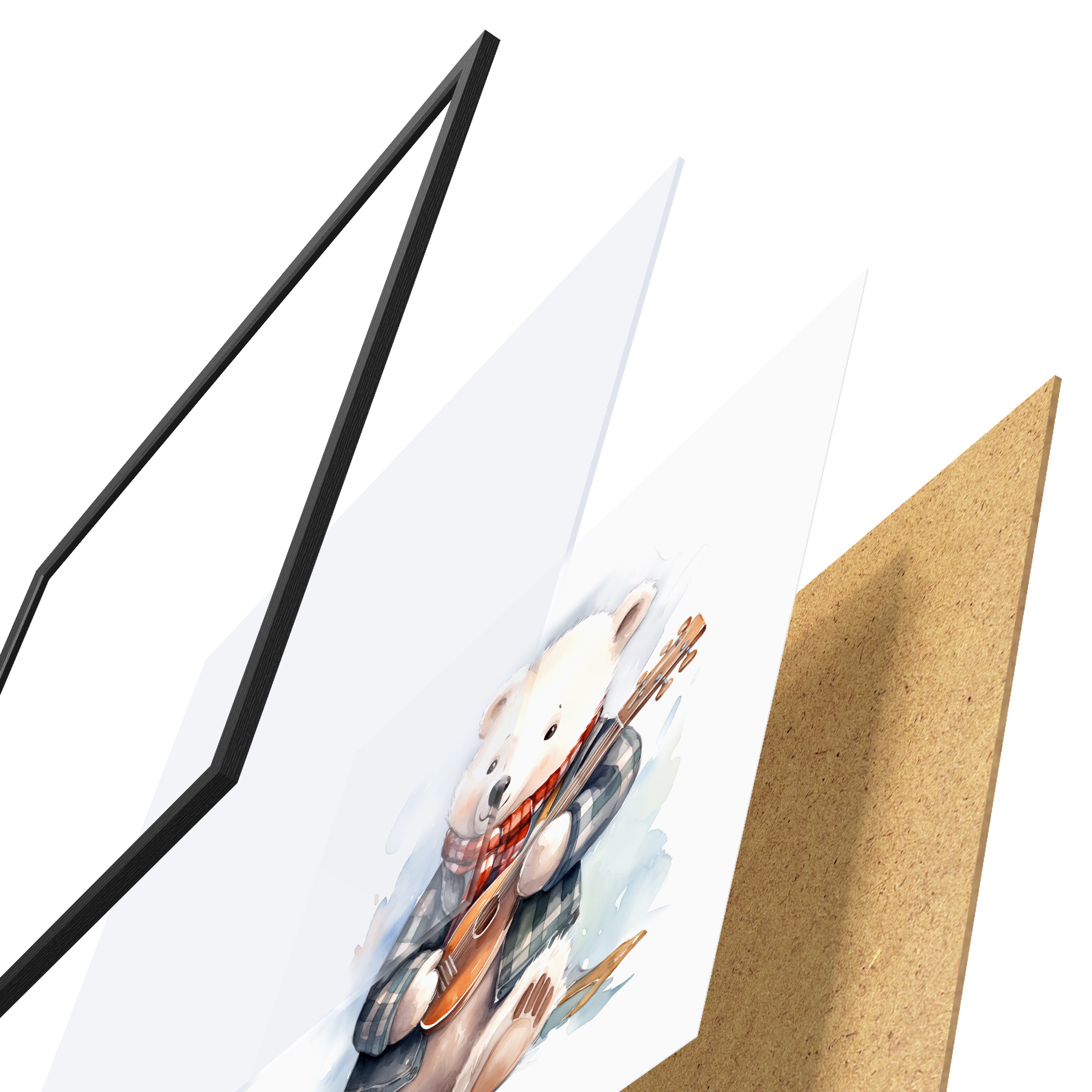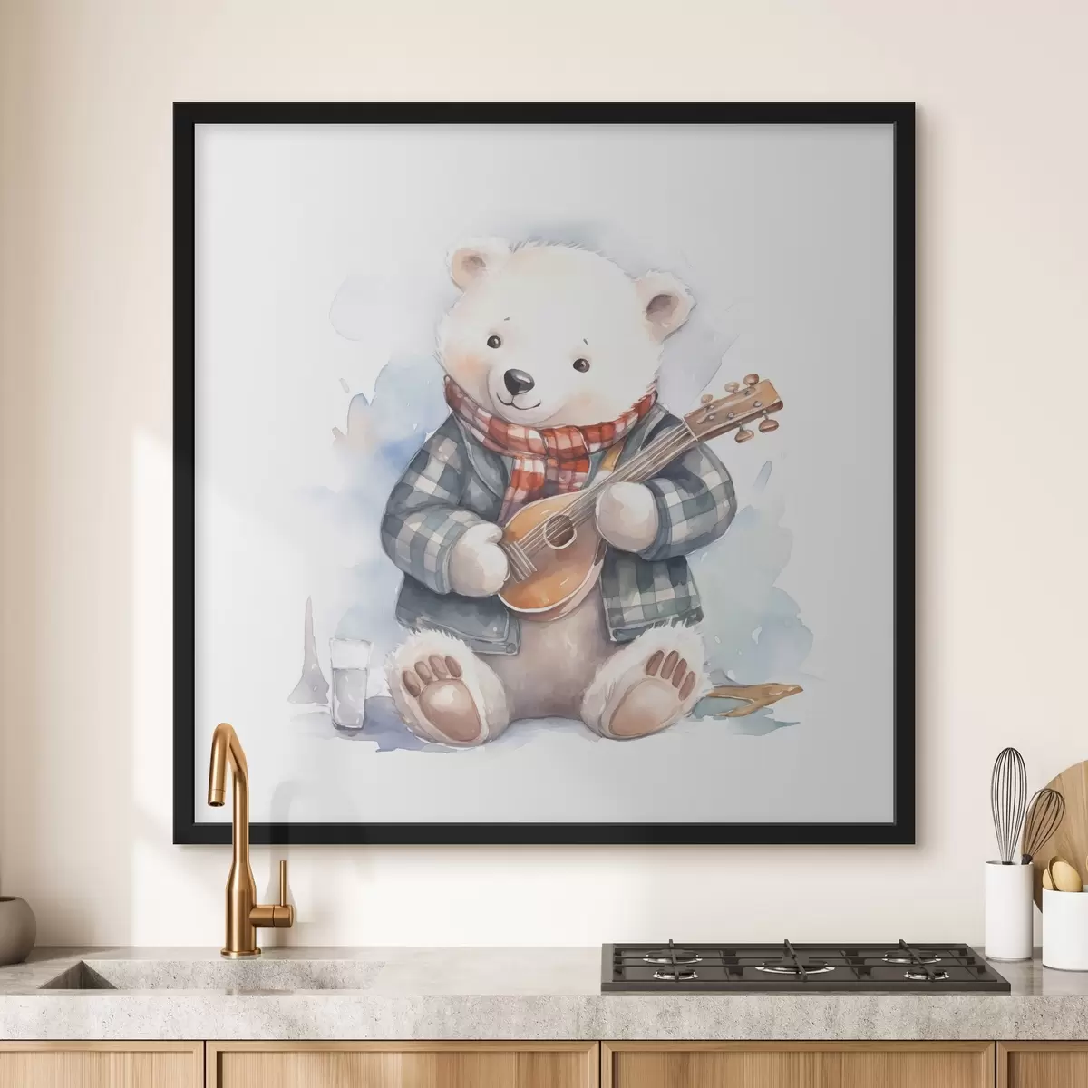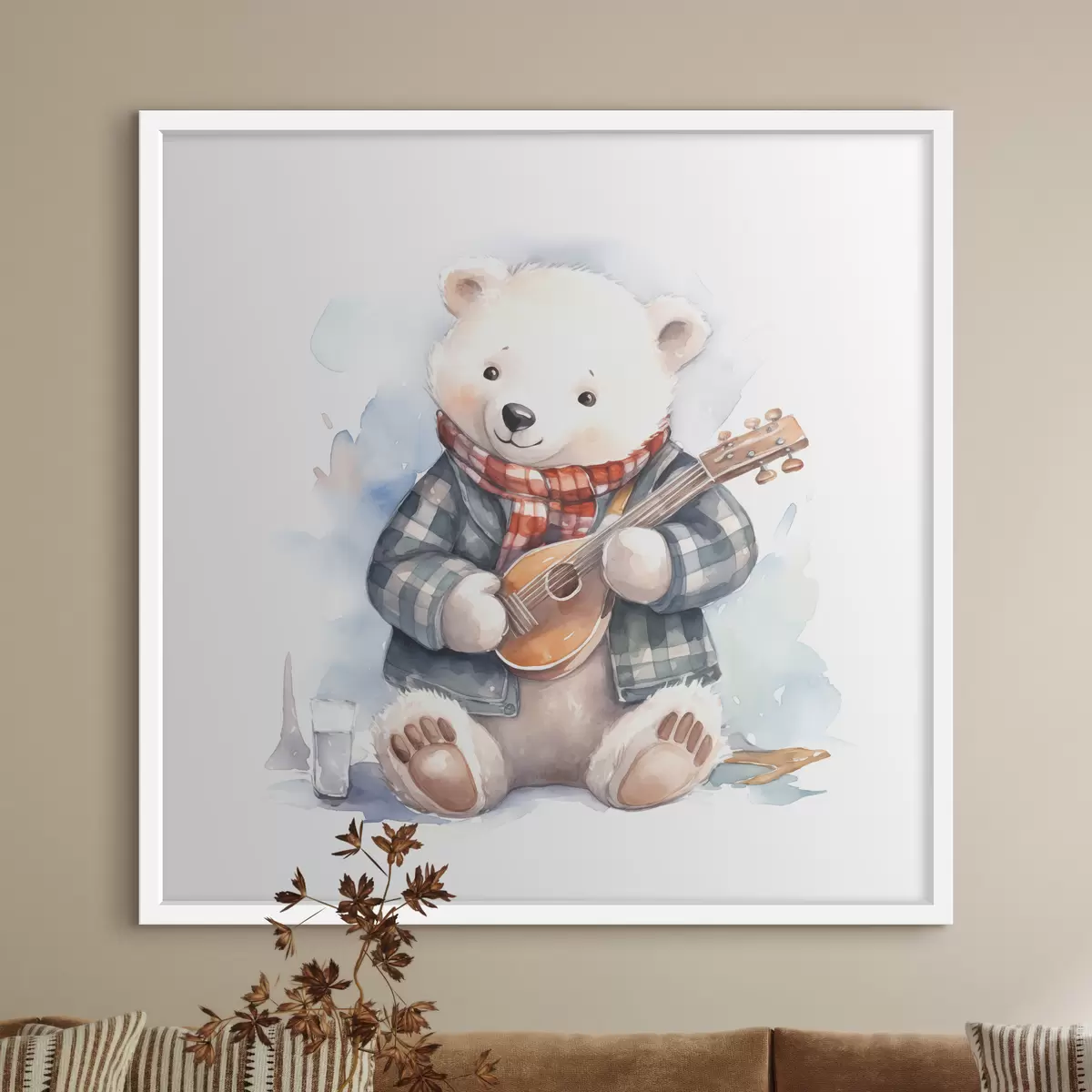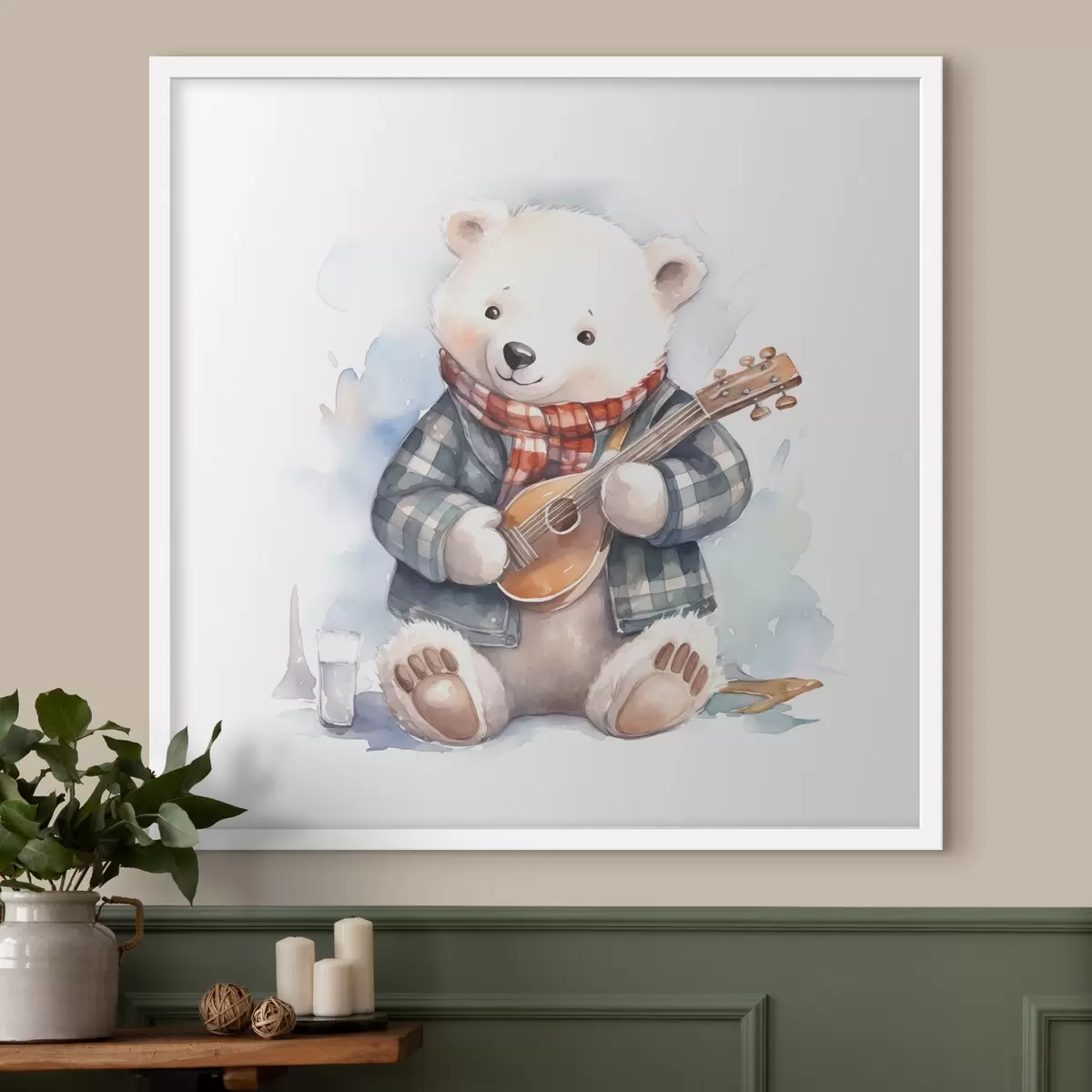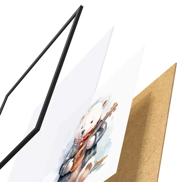Poster Eisbär Musiker in einem blau-karierten Anzug und rotem Schal spielt die Gitarre Aquarell Illustration für Kinder f39120