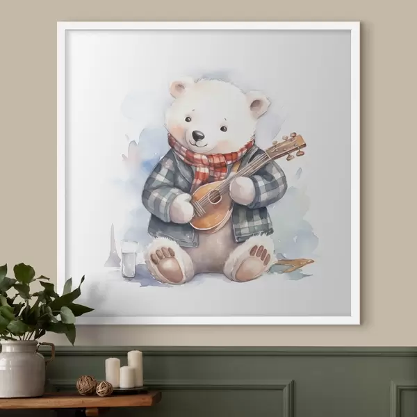 Poster Eisbär Musiker in einem blau-karierten Anzug und rotem Schal spielt die Gitarre Aquarell Illustration für Kinder f39120