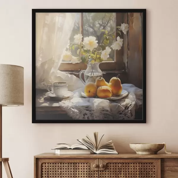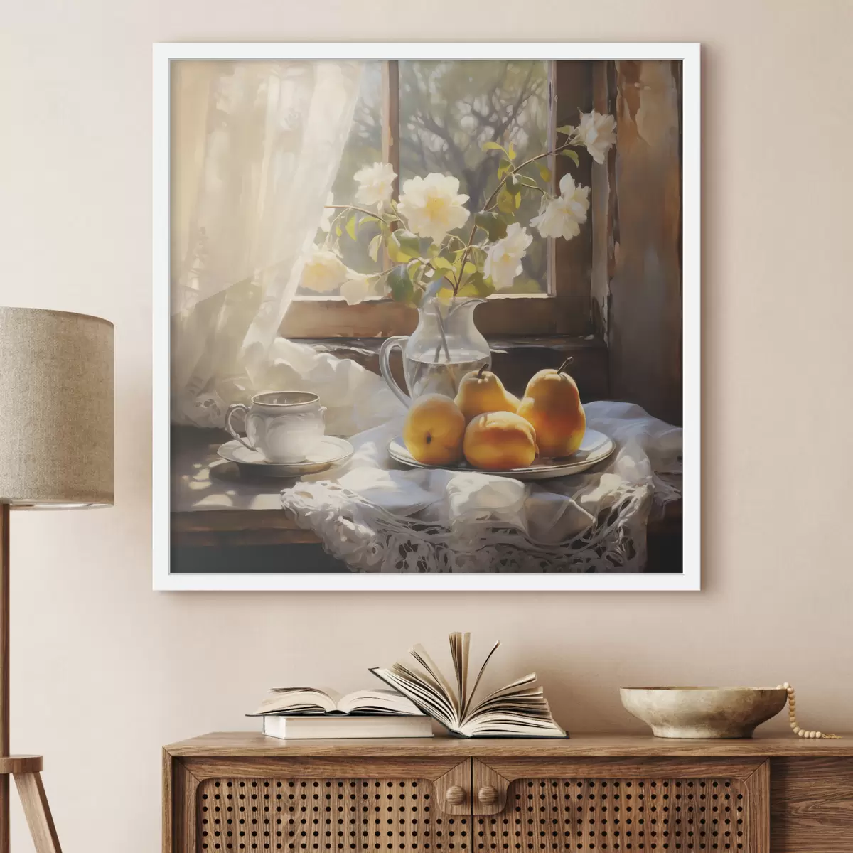 Poster Rustikales Stilleben mit gelben reifen Birnen auf einem Teller auf einem Tisch am Fenster, weiße Rosen in einem Glaskrug, weiße Spitzenvorhänge Nr f39129
