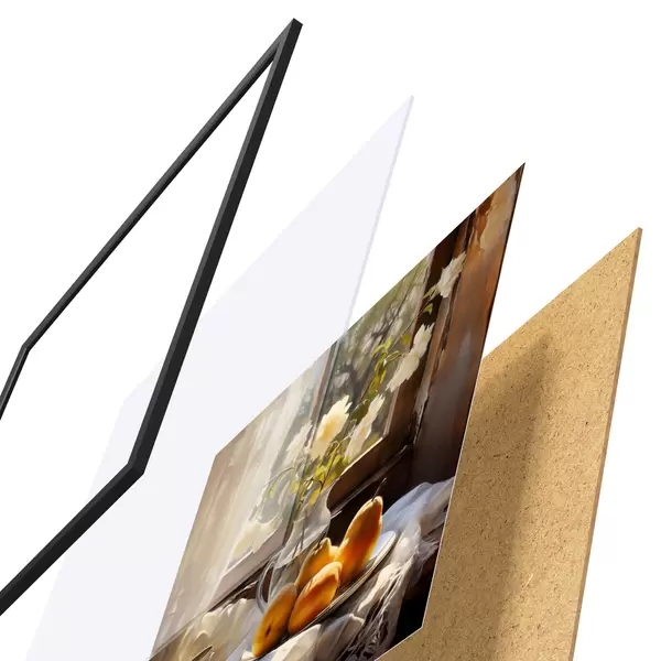 Das Poster besteht aus einem Rahmen, Plexiglas, einem gedruckten Bild und einer Rückwand aus Spanplatten. Dank der Halterungen auf der Rückseite kann das Poster sofort an die Wand gehängt werden.