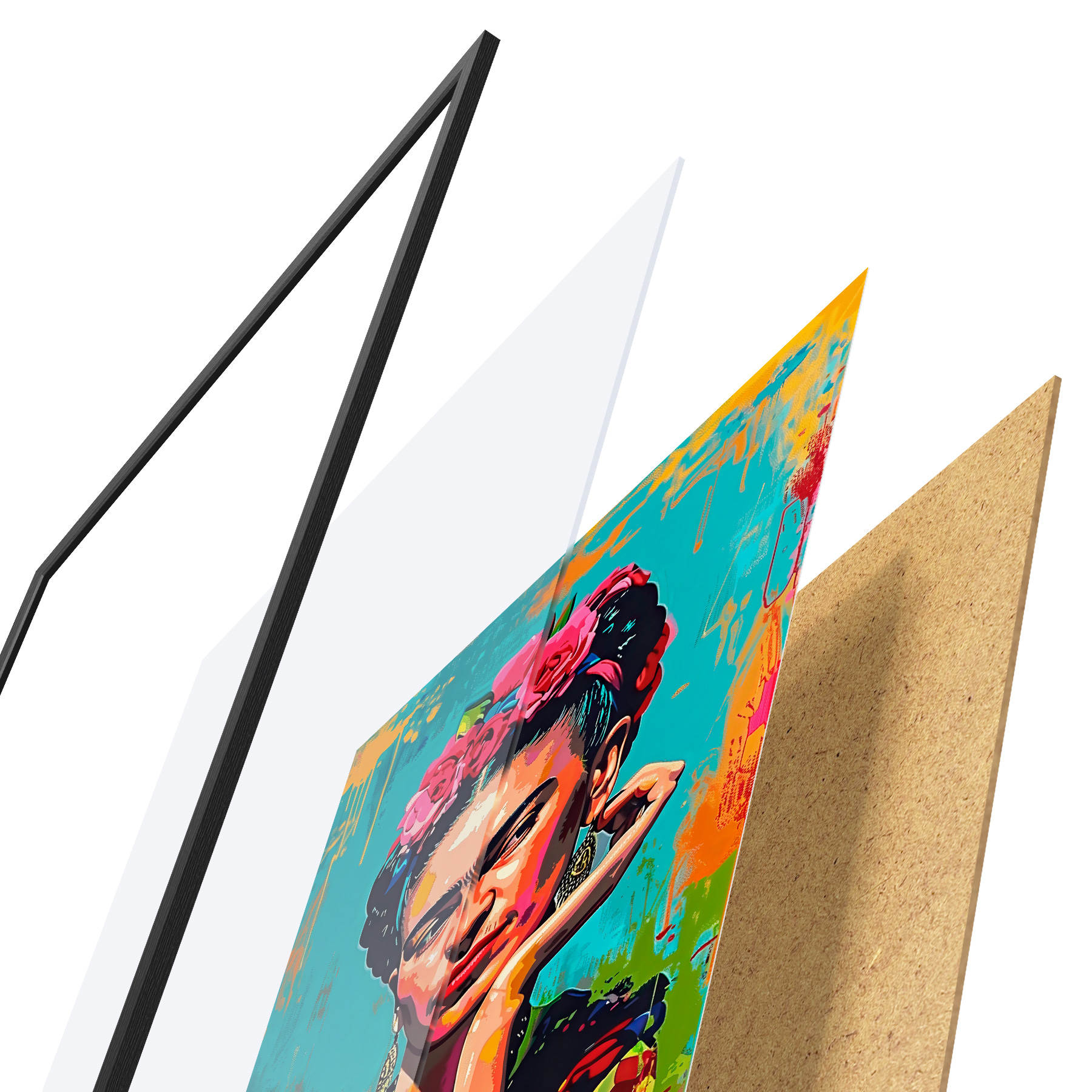 Das Poster besteht aus einem Rahmen, Plexiglas, einem gedruckten Bild und einer Rückwand aus Spanplatten. Dank der Halterungen auf der Rückseite kann das Poster sofort an die Wand gehängt werden.