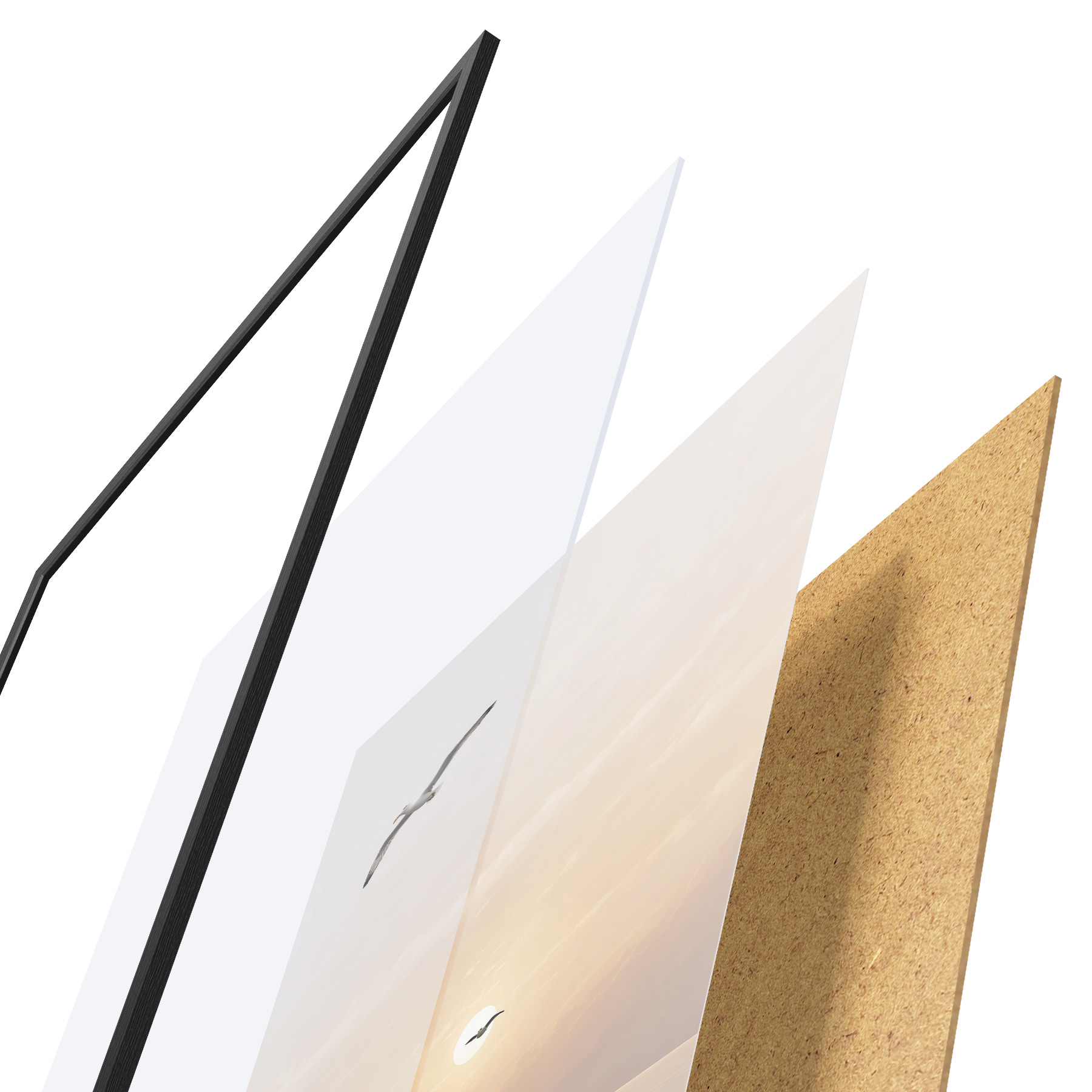 Das Poster besteht aus einem Rahmen, Plexiglas, einem gedruckten Bild und einer Rückwand aus Spanplatten. Dank der Halterungen auf der Rückseite kann das Poster sofort an die Wand gehängt werden.