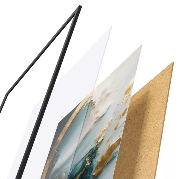 Das Poster besteht aus einem Rahmen, Plexiglas, einem gedruckten Bild und einer Rückwand aus Spanplatten. Dank der Halterungen auf der Rückseite kann das Poster sofort an die Wand gehängt werden.