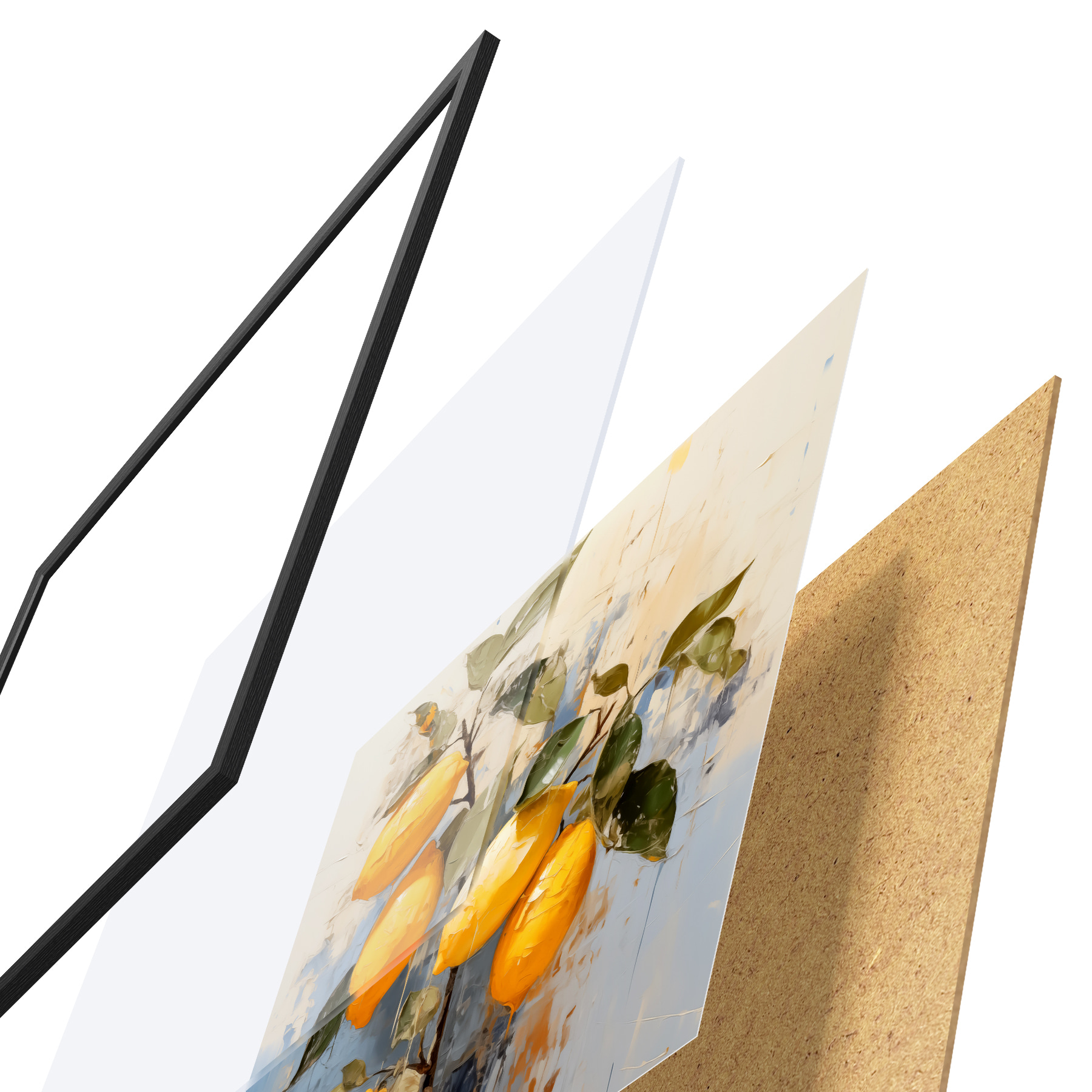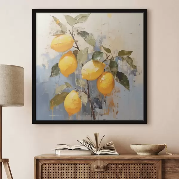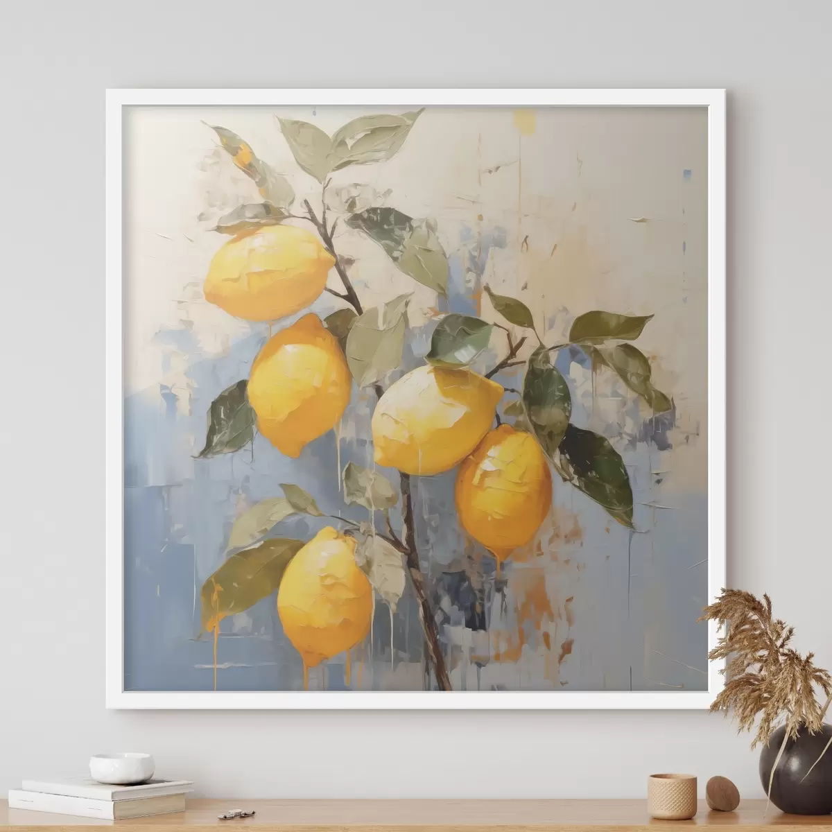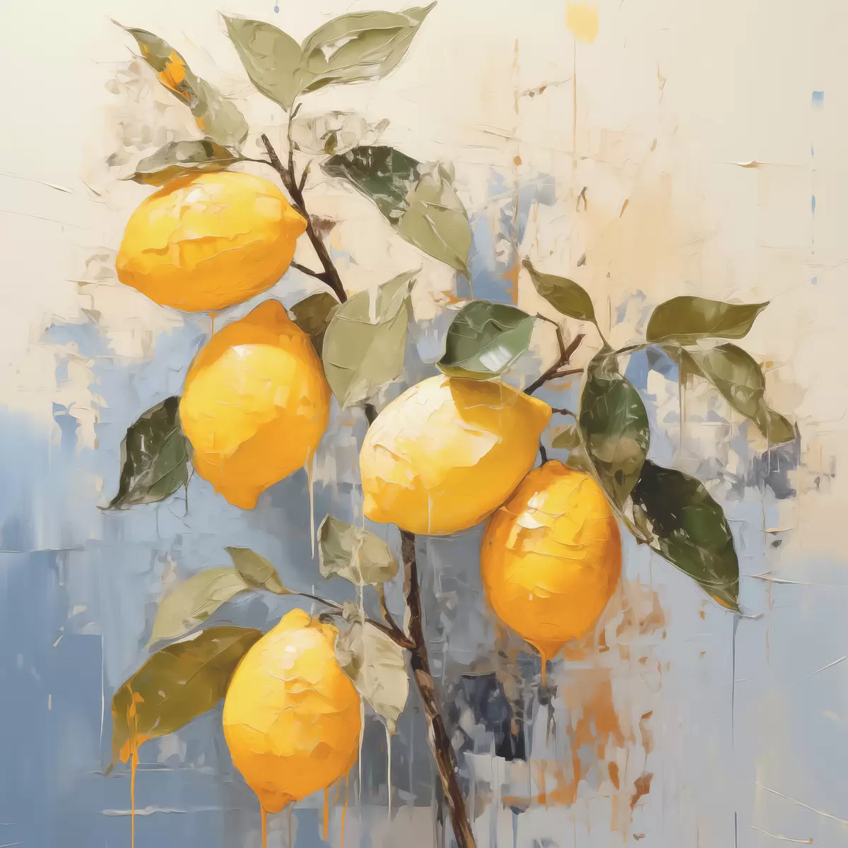 Poster Zweig mit reifen Zitronen, Ölgemälde, abstrakte Kunst, gelbe, blaue und grüne Farben Nr f39186