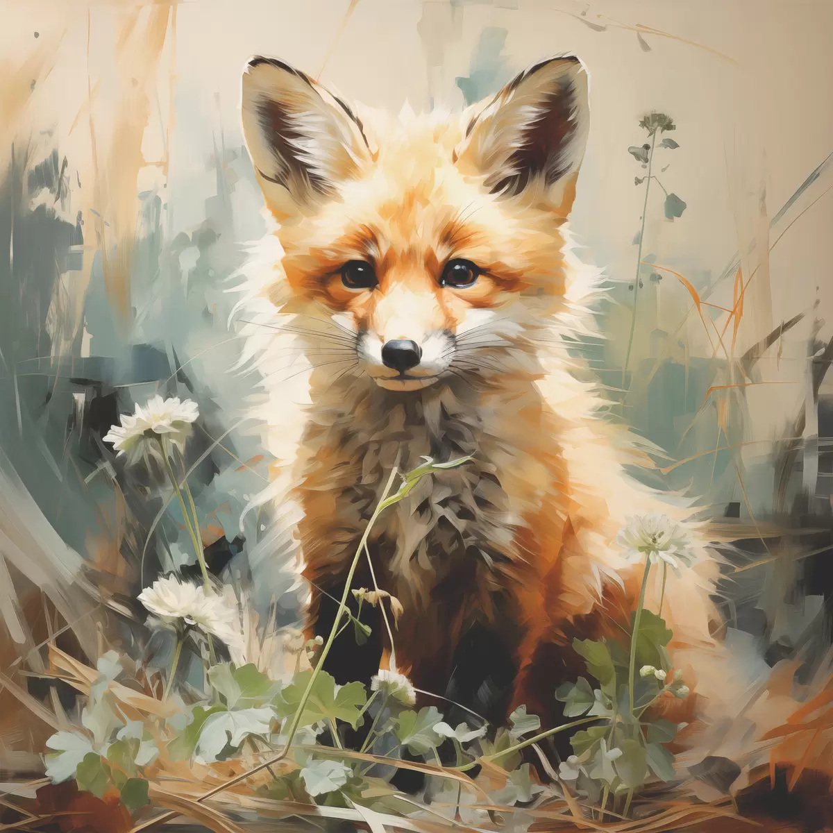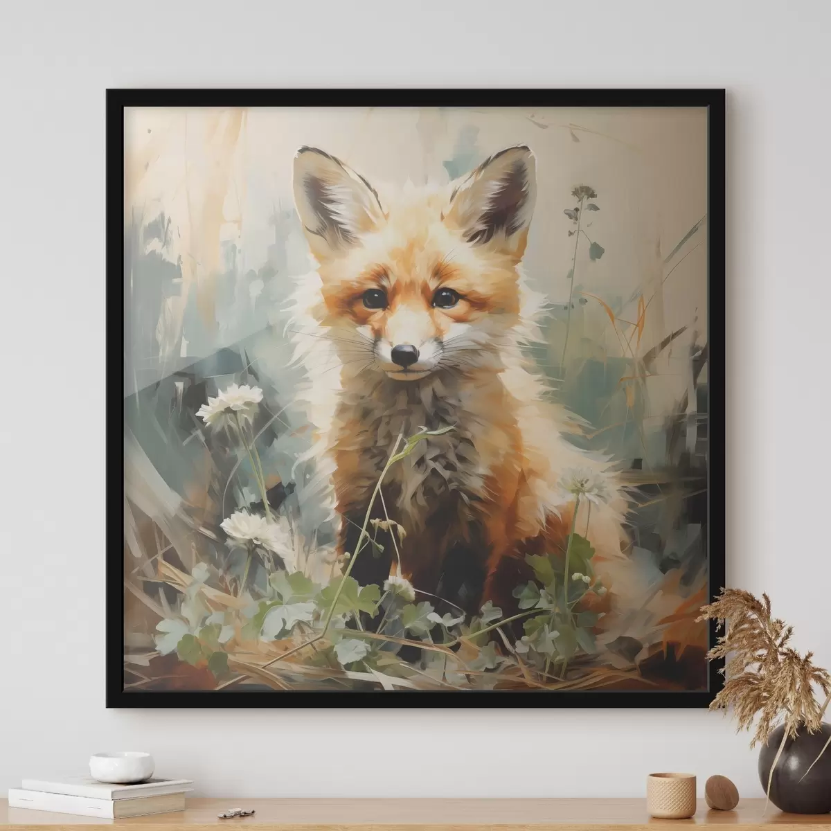 Poster Rotfuchs sitzt im trockenen Gras auf grünem Hintergrund. Ölgemälde f39191
