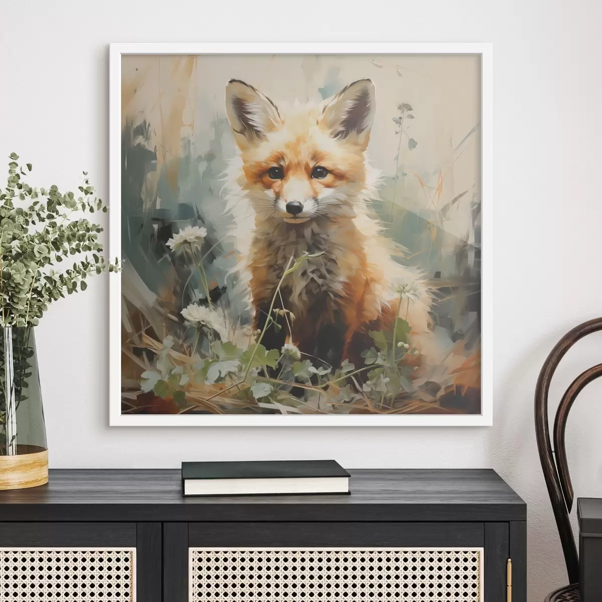 Poster Rotfuchs sitzt im trockenen Gras auf grünem Hintergrund. Ölgemälde Nr f39191