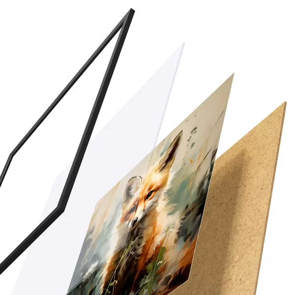 Das Poster besteht aus einem Rahmen, Plexiglas, einem gedruckten Bild und einer Rückwand aus Spanplatten. Dank der Halterungen auf der Rückseite kann das Poster sofort an die Wand gehängt werden.