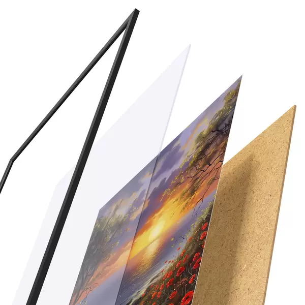 Das Poster besteht aus einem Rahmen, Plexiglas, einem gedruckten Bild und einer Rückwand aus Spanplatten. Dank der Halterungen auf der Rückseite kann das Poster sofort an die Wand gehängt werden.
