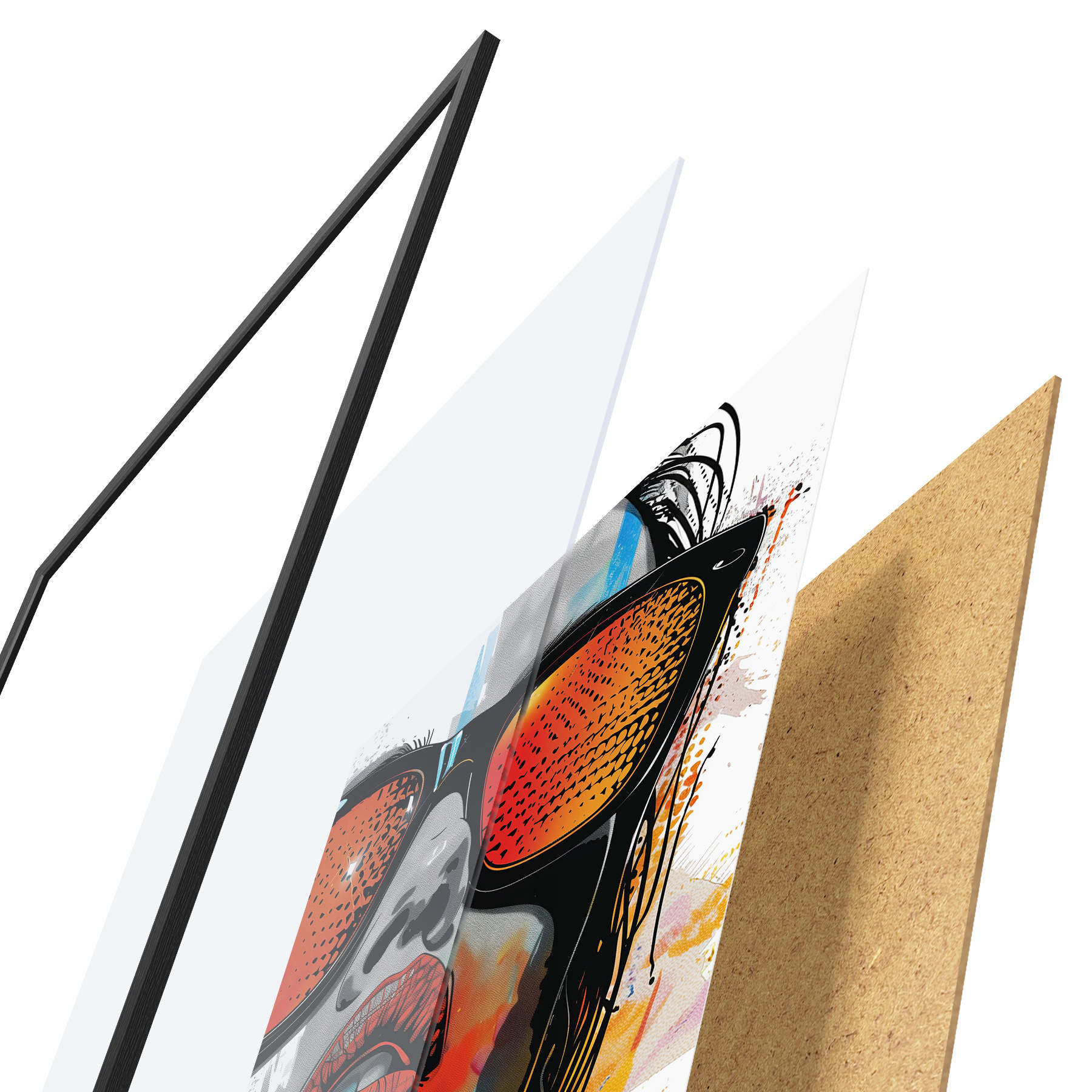 Das Poster besteht aus einem Rahmen, Plexiglas, einem gedruckten Bild und einer Rückwand aus Spanplatten. Dank der Halterungen auf der Rückseite kann das Poster sofort an die Wand gehängt werden.